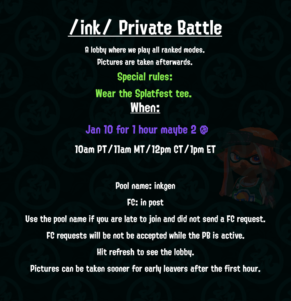 Previous: >>552570543Official: https://splatoon.nintendo.com/Base: https://www.nintendo.co.jp/character/splatoon/en/Wiki: http://splatoonwiki.org/Booru: https://booru.inkgen.moeBuild analyzer: https://sendou.inkPool code: inkgen>News• Splatfest: Friends vs Family vs Solo - 1/9 to 1/11• Splatoon Raiders trailer - https://x.com/SplatoonNA/status/1932422840797524219• Version 10.1.0 patch notes: https://en-americas-support.nintendo.com/app/answers/detail/a_id/59461/~/how-to-update-splatoon-3#v1010• Chill Season is on until 2/28>Media Accountshttps://x.com/SplatoonNAhttps://x.com/SplatoonJPhttps://x.com/SplatoonEU>Map Schedules and Seed Checkerhttps://splatoon3.ink/https://leanny.github.io/splat3seedchecker/#/>Gear, Weapons, and Collectableshttps://leanny.github.io/splat3/catalog.htmlhttps://leanny.github.io/splat3/database.htmlhttps://leanny.github.io/splat3/collectibles.htmlhttps://leanny.github.io/splat3/coop.html