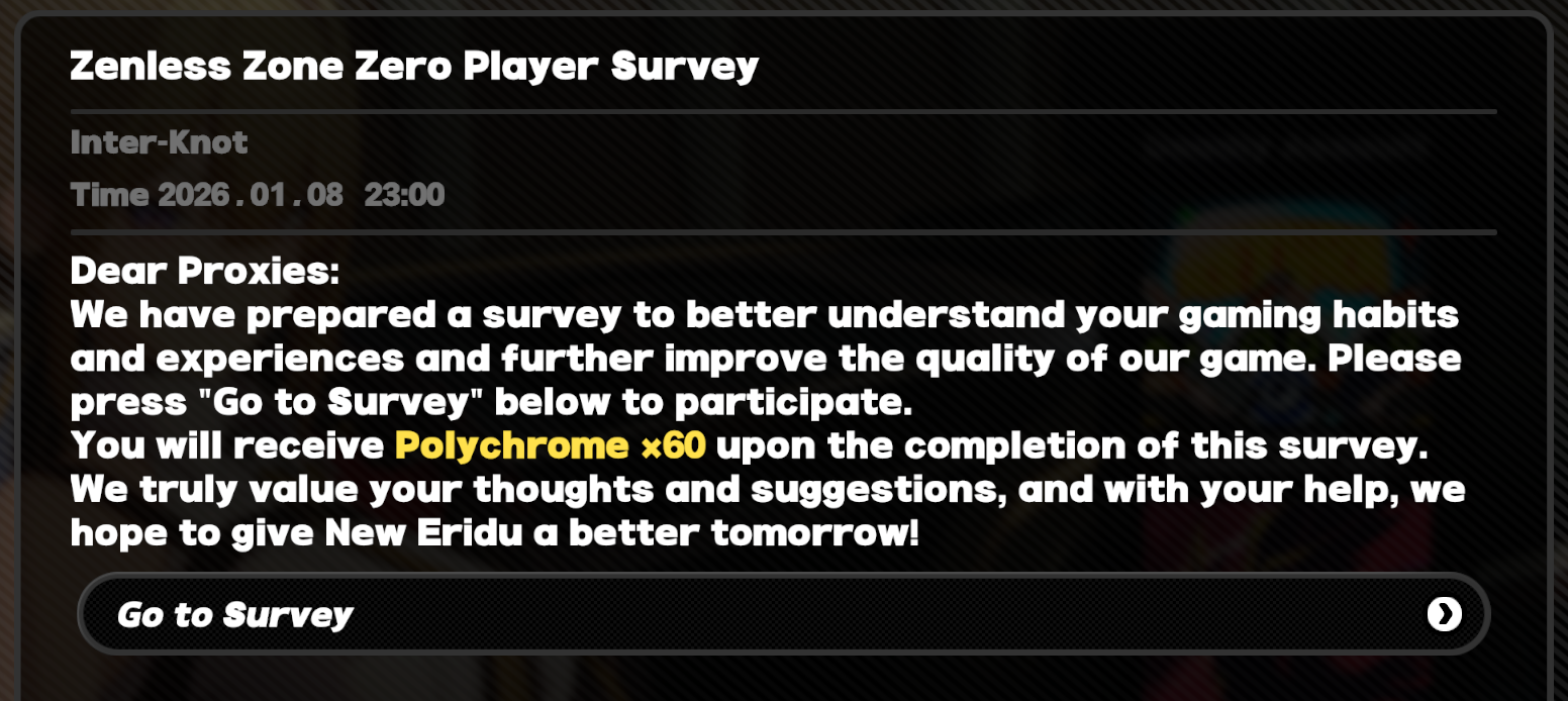 Previous: >>553147060>NewsAgent Record | Ariahttps://www.hoyolab.com/article/43039871Agent Record | Sunnahttps://www.hoyolab.com/article/43037944Version 2.5 Special Programhttps://youtu.be/Ldeqt2WMiYM TGA 2025 Special Videohttps://youtu.be/X-g1N9mNjzs >Newest Trailer/Teaser/Character demohttps://youtu.be/35fRoOYhE6Y (EN)https://youtu.be/BSKG5nhlj5s (JP)https://youtu.be/D_MtaEZRy3E (EN)https://youtu.be/eJBlfglfs-4 (JP)https://youtu.be/9Lshum4Peqw (EN)https://youtu.be/oCcNiUZ5ogU (JP)https://youtu.be/TU5Bt8MLPjk (EN)https://youtu.be/bviZmH3w5ew (JP)>Upcoming Events for 2.5https://zenless.hoyoverse.com/en-us/news/161728All-New Program 12/29 - 02/05Special Visitor 12/29 - 02/09Potential Hypothesis New Chapter Reforged 12/29 - 02/09Sword Seeker Chronicles 12/31 - 02/05Joint Investigation: The Divine Maze 01/03 - 01/22Shadow Riptide Clash 01/09 - 01/26Wish Filing Station 01/14 - 02/02Advanced Bounty: Area Patrol 01/16 - 01/21"En-Nah" Into Your Lap 01/21 - 02/05Angels and Delusions of Muse 01/21 - 02/05Data Bounty: Combat Simulation 01/30 - 02/04Angels of Delusion Training in Progress 01/30 - 02/09>Redeemable codes (claimable in-game or online)https://zenless.hoyoverse.com/redemptionZENLESSGIFTZZZCREATOR25ZZZ25MINAZHAOISFREEMEETTHEVOIDHUNTERShunguangWinterGiftZZZ2026>Resources and useful linkshttps://rentry.org/zzzlinkshttps://rentry.org/ZZZ-Friendshttps://rentry.org/ZZZ-Guilds>/zzz/ OP pastebin (use this if making new thread):https://pastebin.com/PzbMf13P