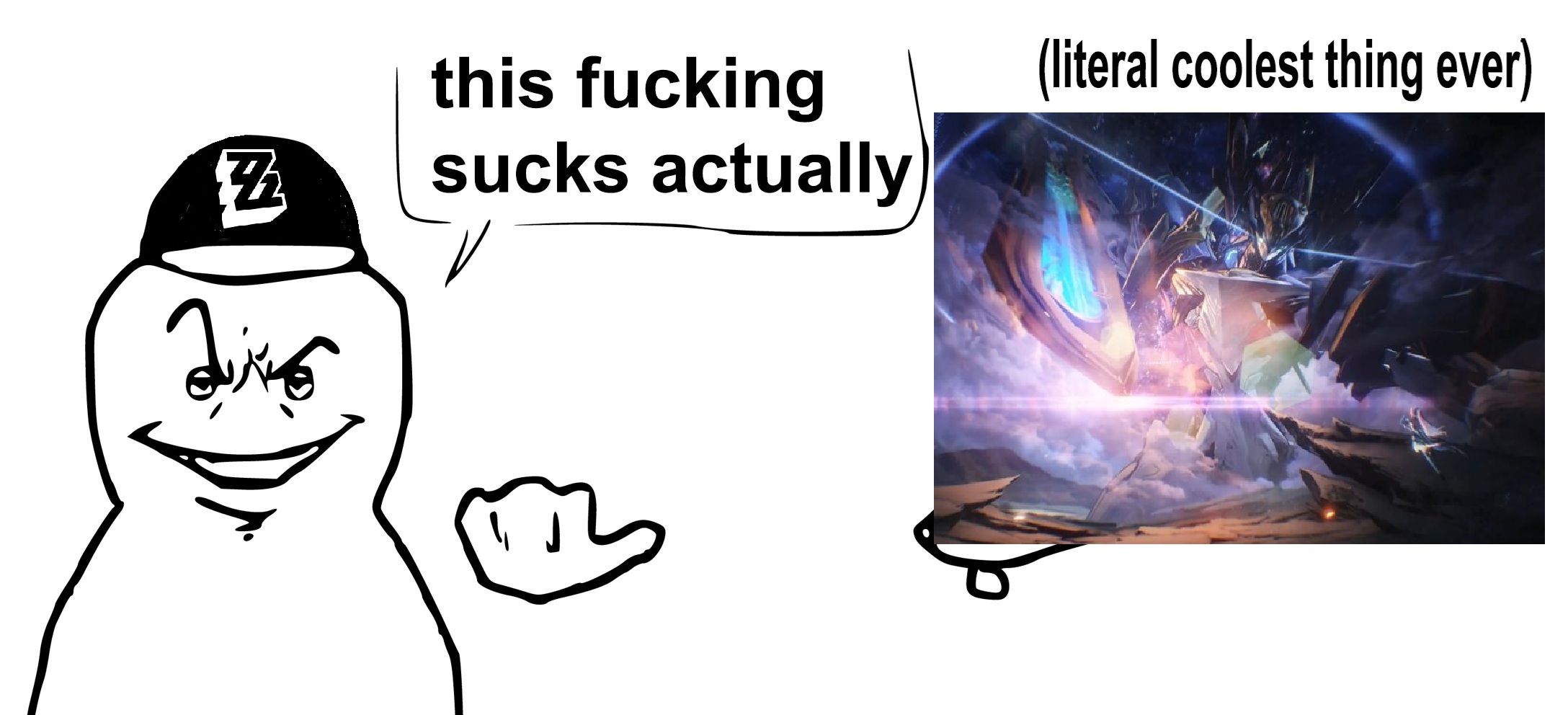 >3.0, 3.1 meet the mayor and his bangboo. Acts helpful but vaguely evil>3.2 Revealed Mayor is big bad.>3.3 you confront Mayor, he transforms, and you beat him. Seems oddly climatic. Scene ends with the shot (from behind in shadow) of a small bangboo shaped figure observing from a distance and waddling away.>3.4 starts and people are celebrating and relaxing. Ethereal portal opens up right on 6th street. The Mayor's Bangboo stands atop a building doing an evil speech.>Bangboo sweeps the floor with each VH or VH adjacent individually in a 1v1.>All this played 100% seriously.>You don't even defeat him in 3.4 and it's all a setup for future story.>Damage from attack changes the environments of 6th street because of rubble and repairs. Without removing them entirely of course for gameplay cohesion.Hire me Hoyo. I can fix your game.