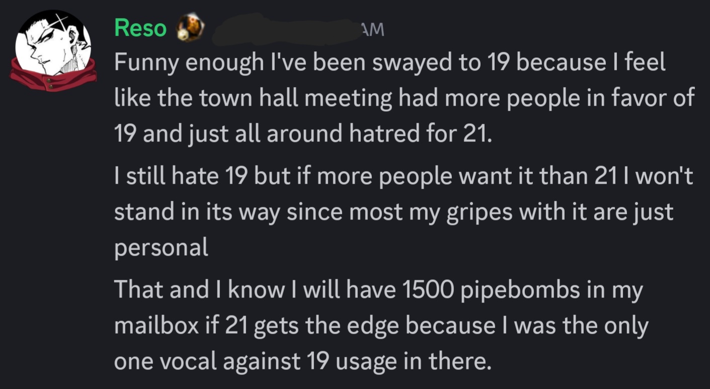 >>553276127The people who wanted 21 made better arguments than the people who wanted 19, who largely seemed to argue against 21 rather than *for* 19. If the decision was made immediately after the town hall 21 would've been chosen. If the decision was made after the feedback form polls 21 would've been chosen (here those two are btw >>553224921). The only people who actually made a good argument for 19 were in VGLco which is why it took days to make a decision, ultimately still settling on 21 for the reasons that have been stated.