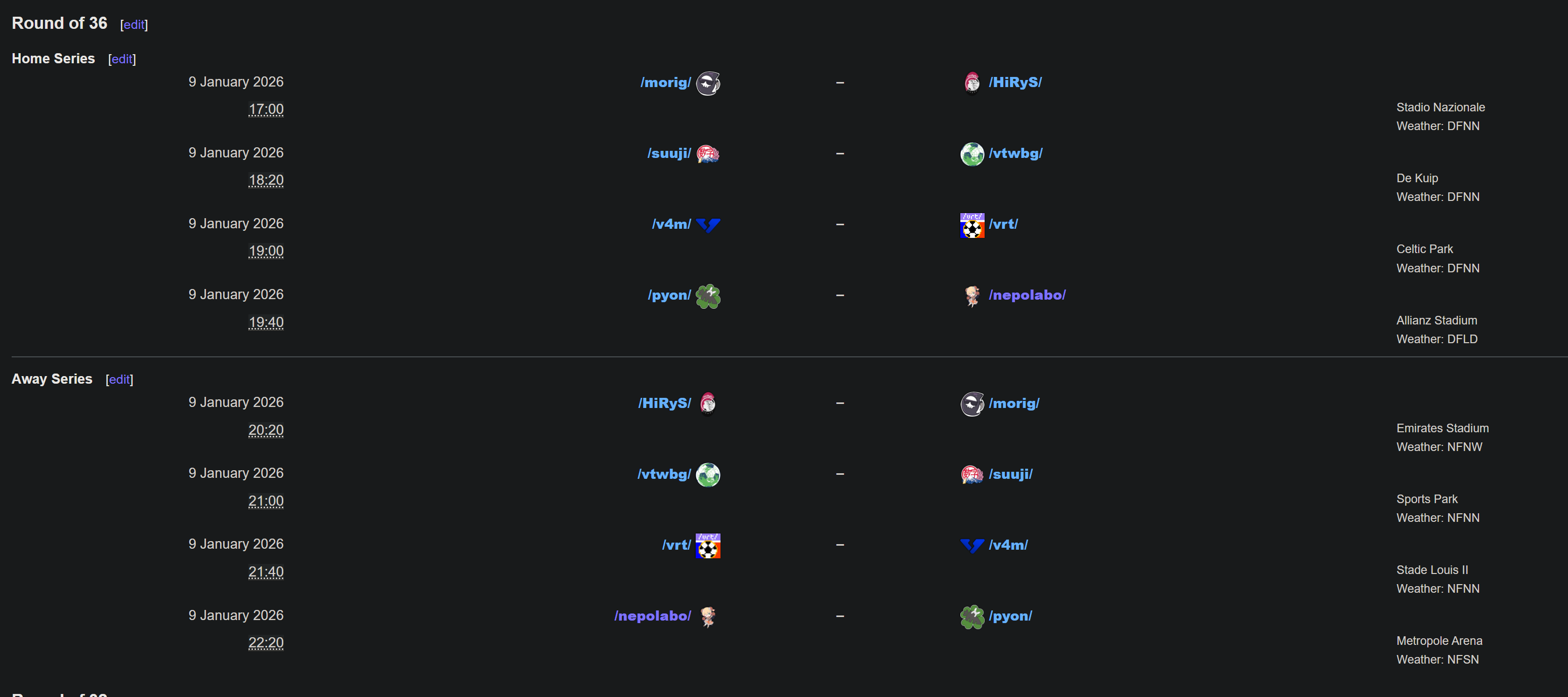 Previous: >>552893013>What... is this?Put simply, a simulation of Pro Evolution Soccer being competed between teams which are embodiments of boards of the 4chan imageboard. The players represent facets of each board's culture. All of the matches are AI versus AI. However, humans "manage" each team, creating their tactics and giving input during games as they happen to make substitutions and tactical changes as they see fit.https://implyingrigged.info/wiki/FAQ>Where can I watch the cup?https://isthisliv.com/4cc/stream.html>Upcoming Cuphttps://implyingrigged.info/wiki/2026_4chan_Winter_Cup>Upcoming Invitationalshttps://implyingrigged.info/wiki/LAN_Party_the_3rd:_Admins_of_the_Frozen_Thronehttps://implyingrigged.info/wiki/2026_4CC_Champions_League>Wiki:https://implyingrigged.info/wiki/Main_Page>Sekkrit Code37pebis>DLC Passworddivegrass>Booruhttps://isthisliv.com/booru/>Other videoshttps://implyingrigged.info/wiki/Videos>PES Infohttps://implyingrigged.info/wiki/Pro_Evolution_Soccer_2015https://implyingrigged.info/wiki/Pro_Evolution_Soccer_2021>Previouslyfile deletedPES21 wonmeltiesshitposting