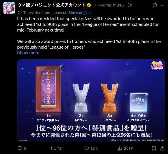 Previous: >>553169886>Global Game NewsLink your account to Cygames iDCurrent Scenario: Aoharu Hai aka "Unity Cup"Current Rate Up Trainee: Christmas Oguri Cap (3* alt), Christmas Biwa Hayahide (3* alt), Mejiro Dober 3*Current Rate Up Support Cards: Narita Taishin (SSR), Mayano Top Gun (SSR), Daitaku Helios (SSR), Vodka (SR)Late January - Sagittarius Cup - Nakayama Turf 2500mhttps://umamusume.com/news/100040/https://pages.snep.pw/uma/anni-skill-changes/>JP Game NewsCurrent Rate Up: NY Sakura Laurel 3*, NY Ikuno Dictus 3*, Oguri Cap 3* (Cinderella Form), Stay Gold 3*, Air Groove (Speed SSR), Fine Motion (Power SSR) Inari One (SSR), Mejiro Dober (SR)New Scenario "Yukoma Hot Spring" releasedTimeline: https://uma.moe/timelineCygames Webstore: https://webstore.cygames.com/en/umamusume_en/>Thread Clubshttps://rentry.co/umaglobalclublistYou must be E3 (20k points) to join a circle. Apply with /uma/ or /vg/ in your profile or post ID in the thread.>All Guides & Resourceshttps://rentry.org/uma26Game databasehttps://gametora.com/umamusume (Click the gear to switch between JP / global server info)A basic guide for newfagshttps://rentry.org/umaglobalFind networks if your region is blocked from the game or clienthttps://www.umavpn.top/93Seiyuu & Concertshttps://rentry.org/umstUma Texthttps://umareader.idsmile.xyz/