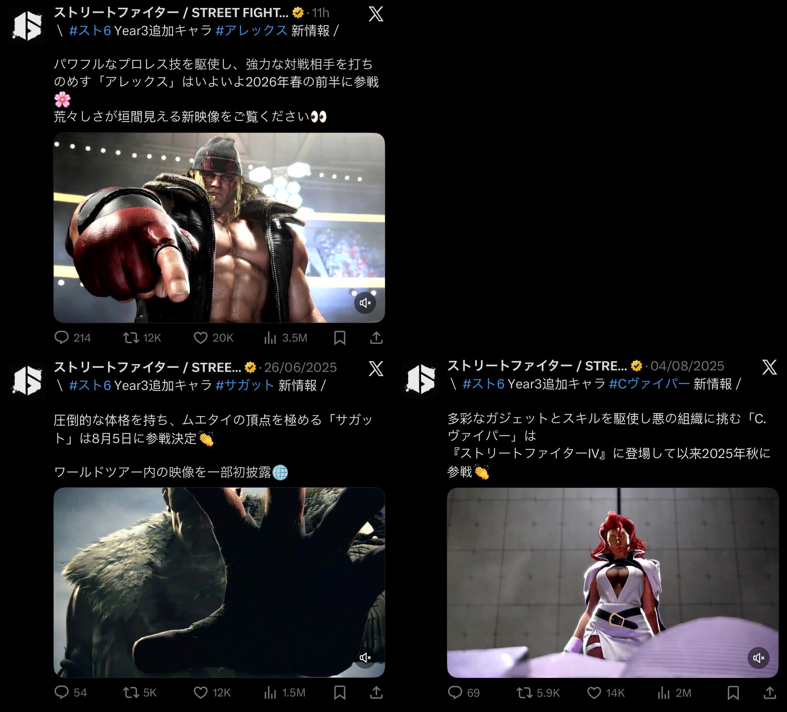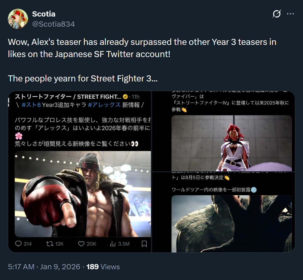 >Alex Teaser Trailerhttps://www.youtube.com/watch?v=ak5duys62wk>Fighter Sports Meet Battle Passhttps://www.youtube.com/watch?v=vOkxaWOj34s>Year 3 Character Reveal Trailerhttps://youtu.be/ooMm_xsRRyw >Patch Notes for December 2025 (xD)https://www.streetfighter.com/6/buckler/battle_change/20251216>The official Capcom Pro Tour website is livehttps://sf.esports.capcom.com/cpt/>High level replayshttps://replaytheater.app/?game=sf6>Street Fighter 6 Frame Datahttps://ultimateframedata.com/sf6/https://fullmeter.com/fatonline/#/calculators>SuperCombo Wikihttps://wiki.supercombo.gg/w/Street_Fighter_6>Fighting Game Glossaryhttps://glossary.infil.net/>Use Fightcade to play ST, A2, A3, 3S, CVS2, etc.https://www.fightcade.com/>Daigo drills (warm-up routine)https://pastebin.com/nWRv2BkLLast Round: >>553159803