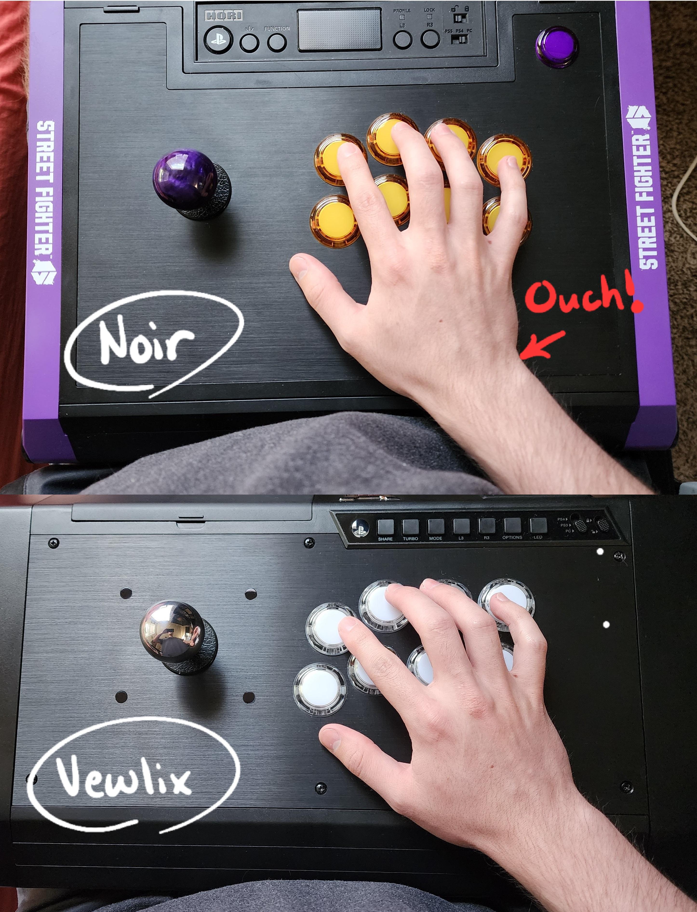 >>553255707that image is an exaggeration but generally the nior layout is only more ergonomic if you're playing on a cabinet. but if the stick is on your lap then vewlix is better because your hand comes in at about 30-45 degree angle, which puts your pinkie higher on the stick, and actually makes it easier to use those buttons on vewlix. I have a hori fighting alpha with both vewlix and nior layouts and vewlix is clearly better for me.