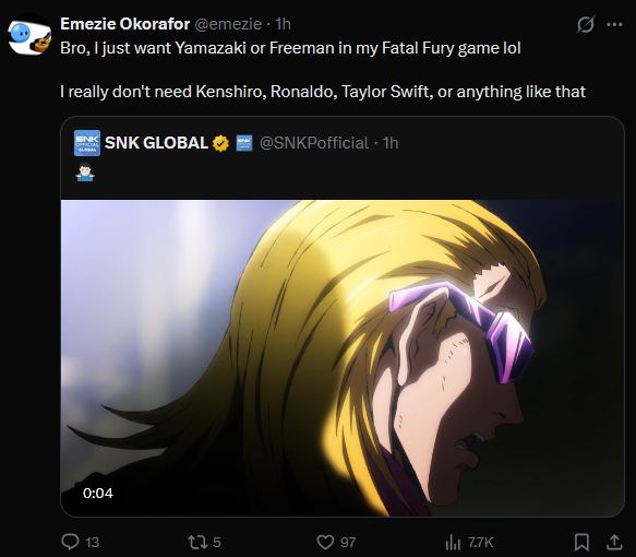 >>553259829I trust them not to resurrect Geese canonically. At least I'd hope.They have him in KoF still, there's no need to resurrect him in Fatal Fury, too.