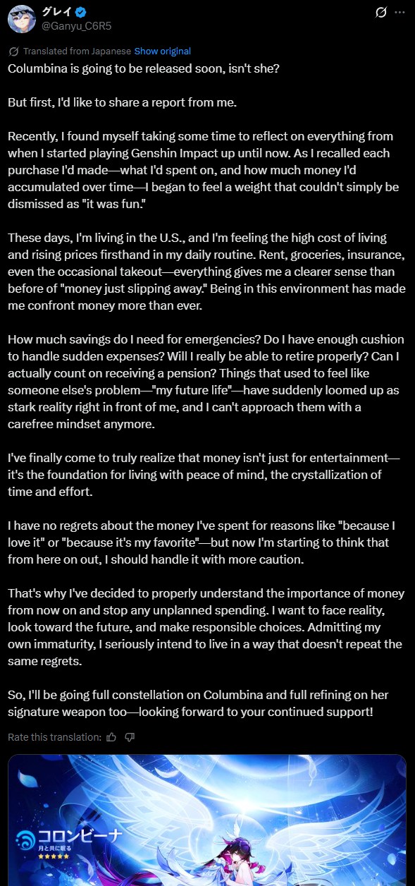 Previous: >>553163397 >Character Teaser - "Columbina: Where She Dwells"https://youtu.be/ME4OGvcPBUs (EN)https://youtu.be/7zLvIrPBGF4 (JP) >Version "Luna IV" "A Traveler on a Winter's Night" Trailerhttps://youtu.be/_yuHIzPJGHA (EN)https://youtu.be/wTL5hRtmWjM (JP) >Outfit Teaser: Teyvat Style – Nocturne of Serenityhttps://youtu.be/Q5I3xKJfIO4 (EN)https://youtu.be/TGsTYPeOtxw (JP) >Current character banner: Xilonen, Varesa, Chevreuse, Iansan, Gaming>Current weapon banner: Peak Patrol Song (Sword), Vivid Notions (Catalyst)https://www.hoyolab.com/article/42820131 >Daily check-in rewards (permanent)https://webstatic-sea.mihoyo.com/ys/event/signin-sea/index.html?act_id=e202102251931481&lang=en-us >Redeemable Codes with Primogems (all regions): https://genshin.mihoyo.com/en/giftGENSHINGIFT8X73KH58KDHNP3GXX56W3VG9 >Useful Links (Wiki, Simulators, Maps, Character Builds, /gig/ friendlist, Third-Party Tools, etc.)https://rentry.org/giglinks /gig/ OP pastebin (use this if making new thread):https://pastebin.com/ca0zseQ9