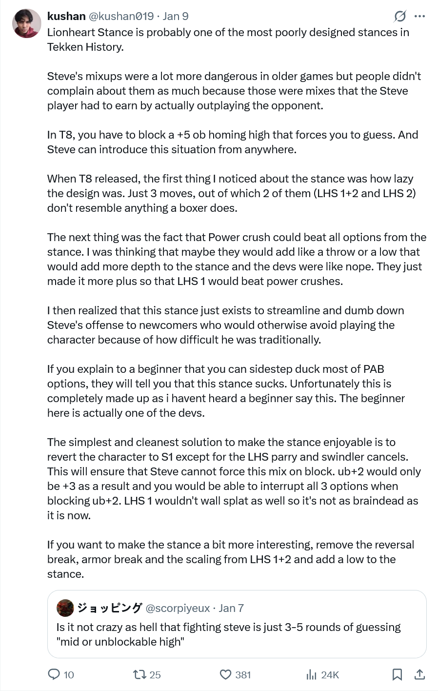 >>553359917But they aren't differentiated is the thing.If Asuka couldn't do ws14 they would be. You have Asuka, high execution but massive reward (easily close to 100 damage combo, up to 115 or so with wall), and Jun who is zero execution but low reward.Instead Asuka can just go for the high execution thing or can just mash heat smash with floorblast or if she doesn't feel like something doing complex she can just do the """"""""minicombo"""""""" that deals the same damage as a full Jun combo.
