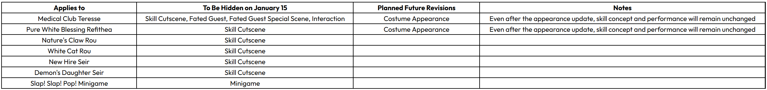 >LIVESTREAM SUMMARY (1/2)Dev. Notes: https://www.browndust2.com/en-us/news/view?id=10061>Content Changes/CensorshipAs part of their desire to branch out further and grow the game, certain 'problematic elements' will be hidden/added back in changed form later:-Medic Teresse: Cutscene, FG, Glutalk, Costume-PWB Refi Cutscene+Costume (she will be more 'fairy-like'), as well as WCRou, NCRou, DDSeir, NHSeir cutscenes.-Slap Slap Pop minigameThe developers offer to retrieve those costumes and reimburse all tickets you spent on them if you don't like this change. >JANUARY-New Character Pack-Onsen Ventana Fated Guest-3 new Costumes: 2x Granadair & Onsen Blade.--Base Granadair: Magic H-Lathel, also restores SP. Pub recruitable.--Shrine Maiden Granadair: Converts debuffs on your team into buffs, strength depends on the # of debuffs she converts.--Onsen Blade: Got a hot cutscene to offset the 'tame' design. Combat-wise she gets extra damage vs. enemies the more debuffs they have.-OSLiberta Prestige Skin/interaction had to be scrapped because it was 'too much' in various ways. Instead it will debut as a "Special Skin" (cheaper but no interaction) with the 1000-day update in March. When the time is right/at offline events they will show why the interaction had to be cancelled-Next raids: Dark>Light (FH), Water (GR)-Finds/glutti absorb is now 1x per week per map (7x rewards), no more daily sweeps. -Crits are now per action instead of per hit per turn.-Other QoL like Glutalk chat replays>Lifestyle Content-SQUARE: Wilhelmina & Justia avatars, new cosmetics, unique motions per character, chat auto translation.-INTERACTIONS: In the Square, you can zoom in on your chibi to trigger live interaction mode (headpats, lift them up to see their panties). You can also join other users performing a motion.-FISHING: 2 new fishing areas, ~30 new fish. Multiplayer fishing (stacking buffs, bait applies to all if 1 uses it), Boat Skins (Deco Coins).