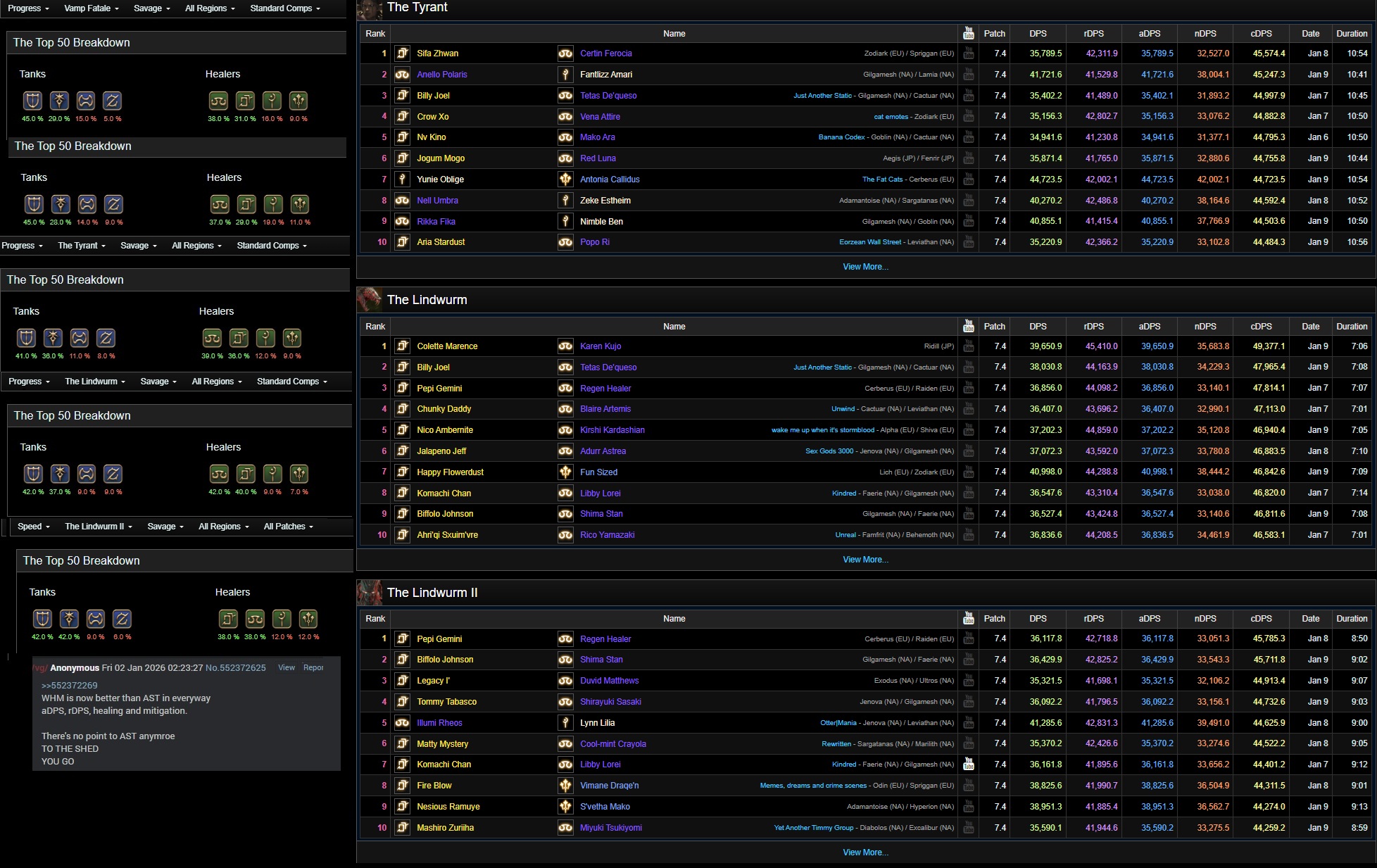 >>553306729about 32k rdps is 50th percentile for bard, so the 30k should still be fine for clearing maybe someone pumped something big into wheel, ads or gaol instead of holding it for vampor didn't properly play into 2m windowstank and healer damage is pretty important tooeven with you brinking that late in the fight there shouldn't be a 6m dps difference, i don't think >>553307284dd > brink tbf dd falls off after like 20s so in some cases you can get away with holding things that you can safely drift a little while still catching buff windows after that it's just crit