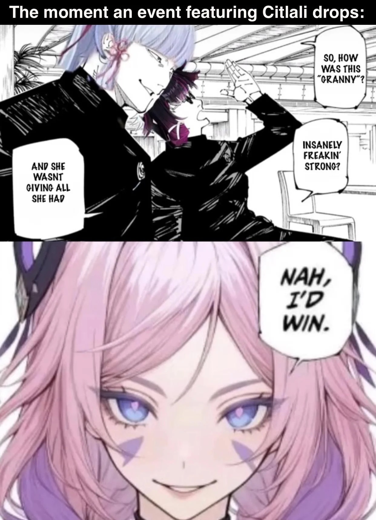 >>553319858oh boy you got me going now>Binding Vow 1I negate my domains sure hit inside Gojo's domain so for extra slashing power to destroy Gojo's 2nd reinforced domainBinding Vow 2decrease range in an attempt to destroy Gojo Basketball sized domainBinding Vow 3The author doesn't even attempt to come up with bullshit and just says "he makes a bunch of sloppy binding vows but is allowed to use malevelont shrine" despite still being brain fucked by Unlimited Void>Binding Vow 4I can use my domain for however long I want against Yuta's domain cuss uhhh reduced range again!!!>Binding VOw 5Furnace can only be used on one target in exchange for speedy use and atomic destruction or some shit, this one is sorta fair if it was permanent how bad that is for it at least.>Binding VOWwe 6Allows trapping non cursed stuff like Maki in his domain>Binding VOWWWW 7!!!! and by far the most egregiousI have to do a buncha words and gesture my palm, in exchange I can world slash instantly once the only time I'd ever need to and one shot GojoReading comprehension?Twas some absurd BV spam man