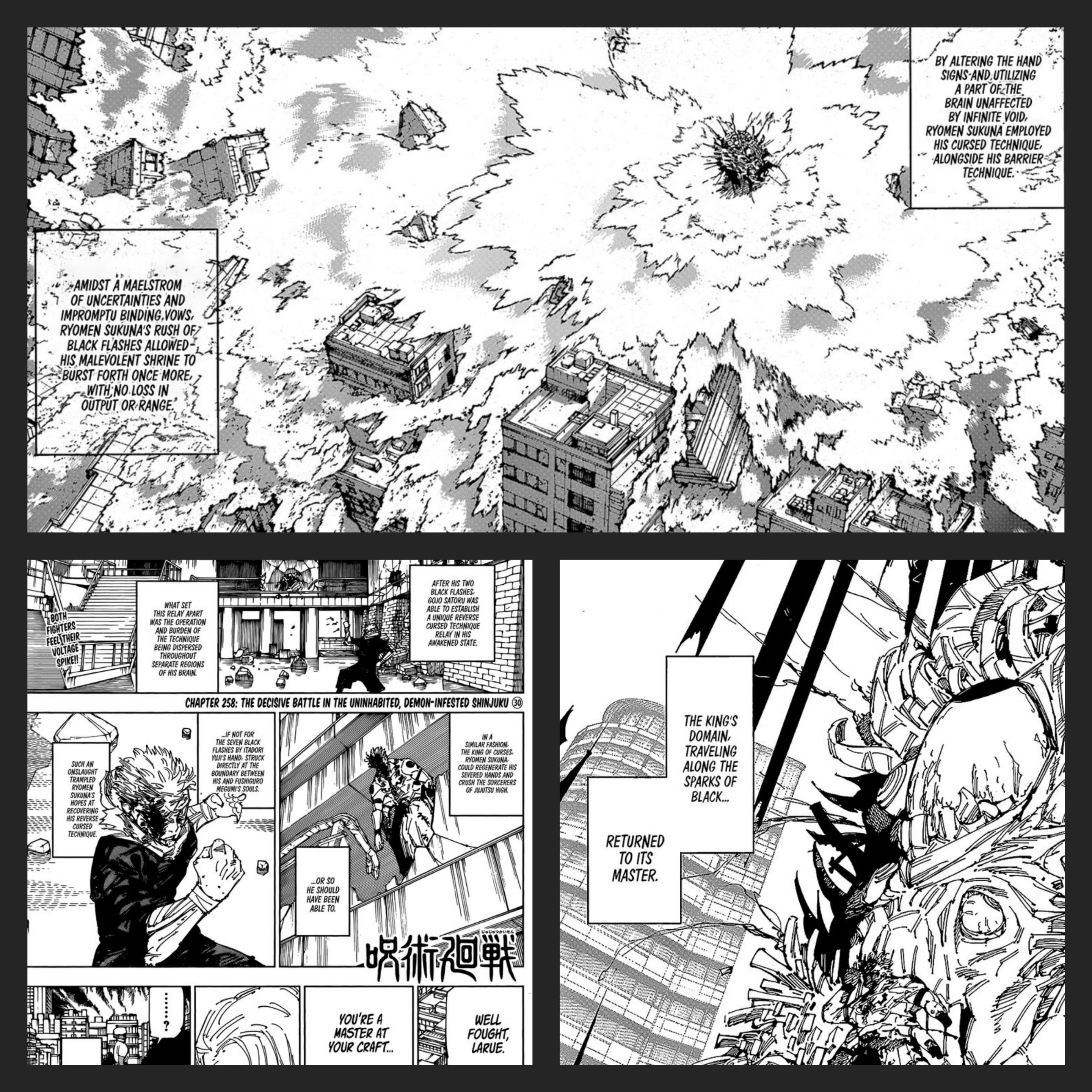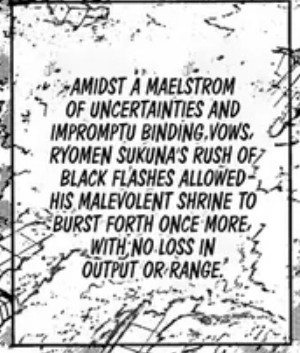 >>553321378>picrelit's literally telling you that it was because of the black flashes. The narrator specifies it in another panel.>>pretty standard binding vow>....Yes. Same as what Gojo did when inverted his barrier and changed its size. Pretty standard.The only actual binding vow was the one to cut Gojo.