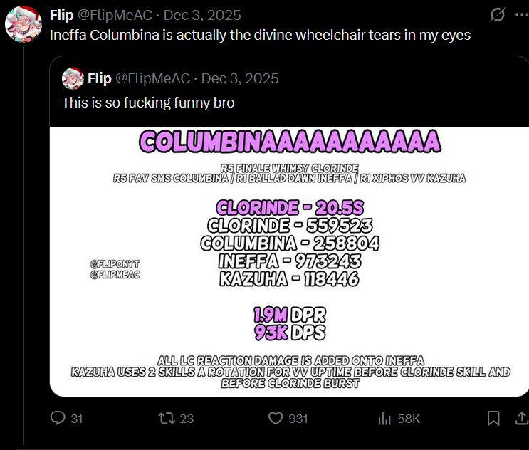 Previous: >>553306746 >Character Teaser - "Columbina: Where She Dwells"https://youtu.be/ME4OGvcPBUs (EN)https://youtu.be/7zLvIrPBGF4 (JP) >Version "Luna IV" "A Traveler on a Winter's Night" Trailerhttps://youtu.be/_yuHIzPJGHA (EN)https://youtu.be/wTL5hRtmWjM (JP) >Outfit Teaser: Teyvat Style – Nocturne of Serenityhttps://youtu.be/Q5I3xKJfIO4 (EN)https://youtu.be/TGsTYPeOtxw (JP) >Current character banner: Xilonen, Varesa, Chevreuse, Iansan, Gaming>Current weapon banner: Peak Patrol Song (Sword), Vivid Notions (Catalyst)https://www.hoyolab.com/article/42820131 >Daily check-in rewards (permanent)https://webstatic-sea.mihoyo.com/ys/event/signin-sea/index.html?act_id=e202102251931481&lang=en-us >Redeemable Codes with Primogems (all regions): https://genshin.mihoyo.com/en/giftGENSHINGIFT8X73KH58KDHNP3GXX56W3VG9 >Useful Links (Wiki, Simulators, Maps, Character Builds, /gig/ friendlist, Third-Party Tools, etc.)https://rentry.org/giglinks /gig/ OP pastebin (use this if making new thread):https://pastebin.com/ca0zseQ9