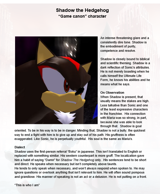 >>553347209>>553346356>>553356848these are actually pretty sicki've never bothered going this far for my own writing beyond checking the games to make sure I have their voice more or less rightreally appreciate the actual citing too, in general people are really bad about saying "oh character is this or this" without any evidence or support at allwould you mind posting more of these, would genuinely like to see 'em
