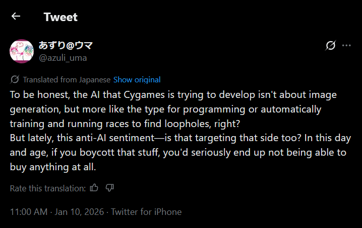 /ourguy/ will drop Umamusume if they added AI assets in the gamehttps://x.com/Rednu23/status/2009871751321399778