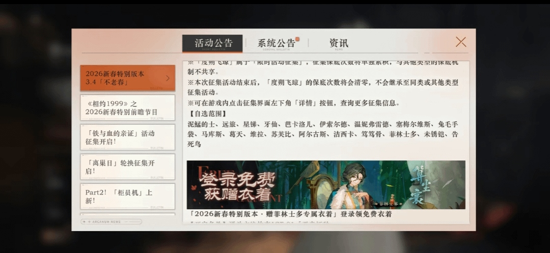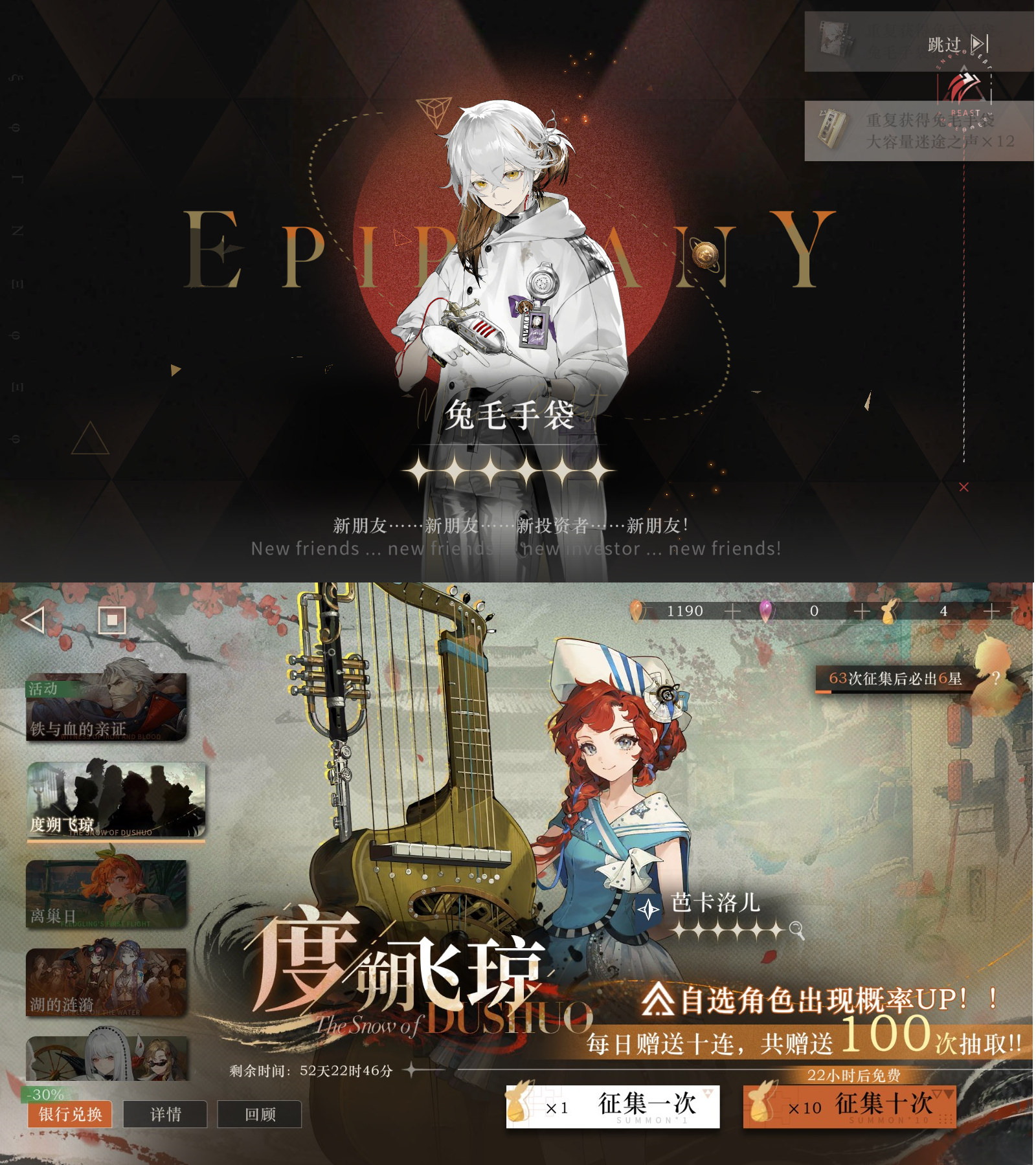 Happy Birthday, Sonetto!Previous Era: >>553327715>General InfoReverse: 1999 is a turn-based gacha RPG with gameplay revolving around the use of spell cards. The game focuses on storytelling, with a rich main story mode and frequent side-story events. The game is fully voiced in 4 languages, with English as the primary one. There are no PvP elements, you can play at your own pace.Daily reset is at 5AM UTC-5>GL 3.1http://youtu.be/f6eay0l0lwM | http://youtu.be/NAzVg7DGnQs>GL 3.2 LIVESTREAMhttp://youtu.be/ff0AiAfBv3I | http://youtu.be/kUJn8JZFrHE>CN 3.3http://youtu.be/AOhLt363y70>CN 3.4 LIVESTREAMhttp://youtu.be/VIbpKZzc9rs12/11 - 01/19 | THE MIDNIGHT WHISTLE>Current Content12/11 - 01/20 | Mane's Bulletin12/11 - 01/20 | The Bottomless Depths12/20 - 01/20 | Pre-Storm Protocol01/01 - 01/20 | Cold Steel (Corvus' Story)01/01 - 01/20 | Puppet Arena - Artefact Masters01/09 - 01/19 | Last Evenings on Earth (RERUN)>Upcoming Content01/15 - 01/20 | Salut, Paname (3.2 Teaser)>Current Banners12/11 - 01/20 | ◈ | Euphoria Rate-up 1x100%: Argus, A Knight, Eternity, Ezra, Medicine Pocket12/30 - 01/13 | ⟳ | Windsong (Star DPS)01/01 - 01/20 | ※ | Corvus (Intellect DPS) - http://youtu.be/PO1yohwlfEg>Upcoming Banners01/20 - ??/?? | ◷ | Beryl (Intellect DPS) - http://youtu.be/Zh9P0uCqin8>Downloadhttp://re1999.bluepoch.com | http://store.steampowered.com/app/3092660>Resourceshttp://rentry.org/1999-resources>Merchandisehttp://reverse1999.store>Codes1999GIFT5YRBRF9GachaGaming1999ShadowedTicketBloodyFairyTaleWhisperingRailsUnscheduledStopMelodyOfLossHeraldOfDeathAccumulatedLiesBerylCrystalReading0110MsTaxiBrume0110TheFinalWedgeGreatMamanBerylFakeBusterBrumeStrangeParisThings