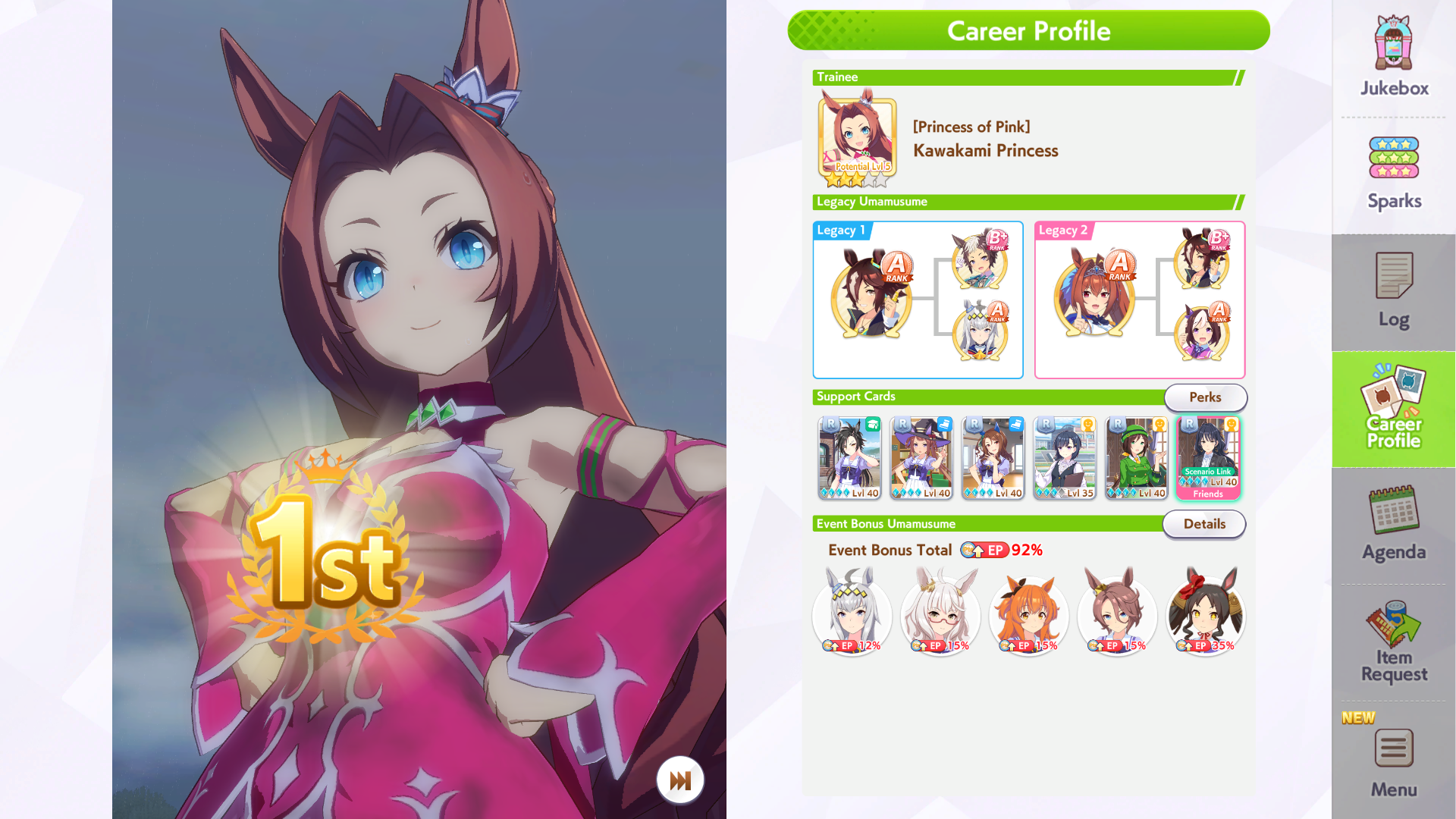 Current Rate Up: NY Sakura Laurel 3*, NY Ikuno Dictus 3*, Oguri Cap 3* (Cinderella Form), Stay Gold 3*, Air Groove (Speed SSR), Fine Motion (Power SSR)