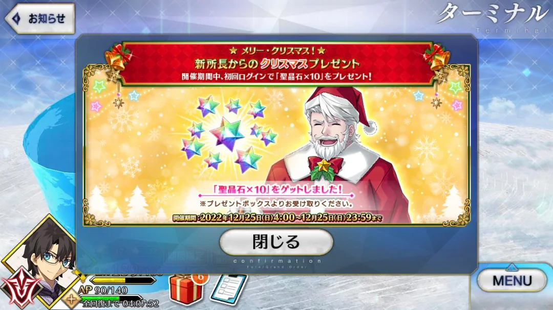 Previous: >>553307471>F/GO Chaldea Satellite Station 2026, Fukui:●Saturday January 17, 17:00 JST.▶Cast: Haruki Ishiya (Beryl Gut), Ayako Kawasumi (Artoria Pendragon), Karin Takahashi (Van Gogh).https://www.youtube.com/watch?v=cExGizUYCS4>"The Beginning of Aftertime":●Release date: January 7 JST.▶Costume dress for U-Olga Marie available at Dress Making Shop after clearing.https://news.fate-go.jp/2026/01/after_time/>Fate/strange Fake PU summon:●January 9~16 JST.5*Archer Gilgamesh (limited)5*Lancer Enkidu (permanent)https://news.fate-go.jp/2026/2026_f_s_f_cp_pu/>2026 New Year's Campaign:●January 1~15 JST.▶Present: 30 SQ, 20.26M QP and a commemorative CE.▶Login Bonus: 30 Hellfire of wisdom, 10M QP, 1 Crystallized Lore, 20 3*Fou-kun (10ATK, 10HP),10 Golden Apple, 1 Beast's Footprint, 2 5*Fou-kun (1ATK, 1HP) and 1 Holy Grail.▶Panel Missions: 5 Summon Tickets, 1 Crystallized Lore, 4.42M QP, 6 SQ, 7 Grail Tears,1 Beast's Footprint, 3 Golden Apples, a limited 3*Command Code and a commemorative CE.▶A Stargazer's Teapot will be added to daily missions rewards (~Jan 7).▶Master level increased to 200.▶The chances of obtaining a great/super success when strengthening a servant/CE will be double.▶AP consumption for Ember Gathering and Training Grounds will be halved.https://news.fate-go.jp/2026/newyear2026_cp/>2026 New Year PU summon:●January 1~14 JST.5*Saber Lord Logres●January 9~11 JST.5*Ruler Mélusine4*Archer UDK-BarghestAll limitedhttps://news.fate-go.jp/2026/newyear2026_pu/>/fgog/ Friendlist form and spreadsheet (2026):https://forms.gle/WK4dwSC6Mn2WQfZu8https://docs.google.com/spreadsheets/d/1leQ09m5klFajbCcededkANJfeMiAmVz-PbCI_r7xyXc/edit?usp=sharing>Utility links:https://pastebin.com/iaWmXAq7