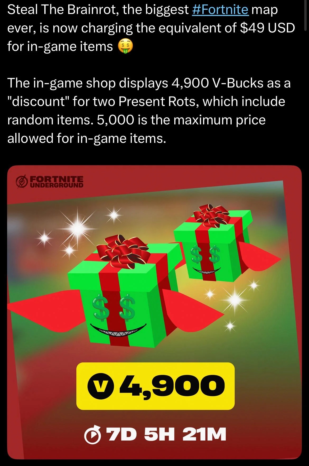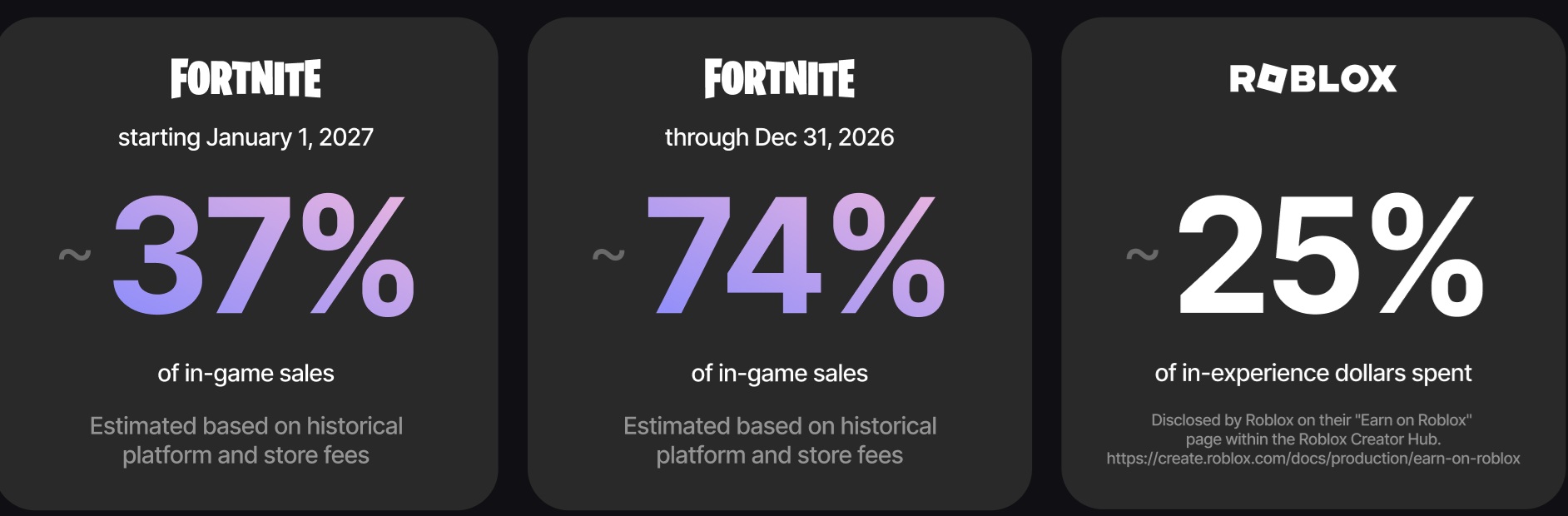 fyi, this is epic's way of getting roblox developers into their system, if you spend $1 in roblox they get 25 cents but if you spend $1 in fortnite they get 74 centsnow obviously it gets halved in 2027 but they might make that amount larger to keep players here instead of roblox
