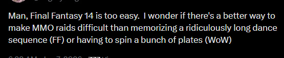 >melees loving this raid tier>casters hate this raid tierLmao, sucks 8.0 raids will be giganeutered from casters crying about needing to move, but all of Arcadion is easily top 2-top 3 raid. Really redeems XIV after Pandaemonium shitfest.