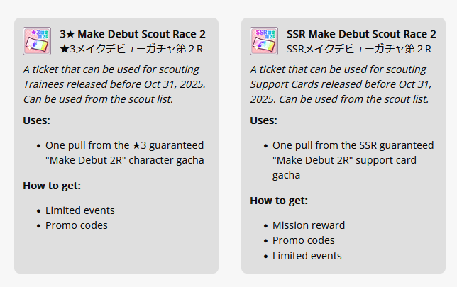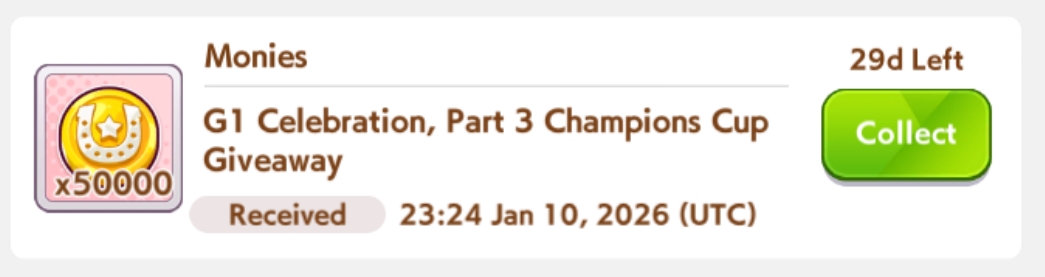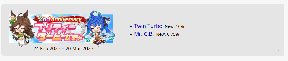 Previous: >>553353940>Global Game NewsLink your account to Cygames iDCurrent Scenario: Aoharu Hai aka "Unity Cup"Current Rate Up Trainee: Christmas Oguri Cap (3* alt), Christmas Biwa Hayahide (3* alt), Mejiro Dober 3*Current Rate Up Support Cards: Narita Taishin (SSR), Mayano Top Gun (SSR), Daitaku Helios (SSR), Vodka (SR)Late January - Sagittarius Cup - Nakayama Turf 2500mhttps://umamusume.com/news/100040/https://pages.snep.pw/uma/anni-skill-changes/>JP Game NewsCurrent Rate Up: NY Sakura Laurel 3*, NY Ikuno Dictus 3*, Oguri Cap 3* (Cinderella Form), Stay Gold 3*, Air Groove (Speed SSR), Fine Motion (Power SSR)New Scenario "Yukoma Hot Spring" releasedTimeline: https://uma.moe/timelineCygames Webstore: https://webstore.cygames.com/en/umamusume_en/>Thread Clubshttps://rentry.co/umaglobalclublistYou must be E3 (20k points) to join a circle. Apply with /uma/ or /vg/ in your profile or post ID in the thread.>All Guides & Resourceshttps://rentry.org/uma26Game databasehttps://gametora.com/umamusume (Click the gear to switch between JP / global server info)A basic guide for newfagshttps://rentry.org/umaglobalFind networks if your region is blocked from the game or clienthttps://www.umavpn.top/93Seiyuu & Concertshttps://rentry.org/umstUma Texthttps://umareader.idsmile.xyz/
