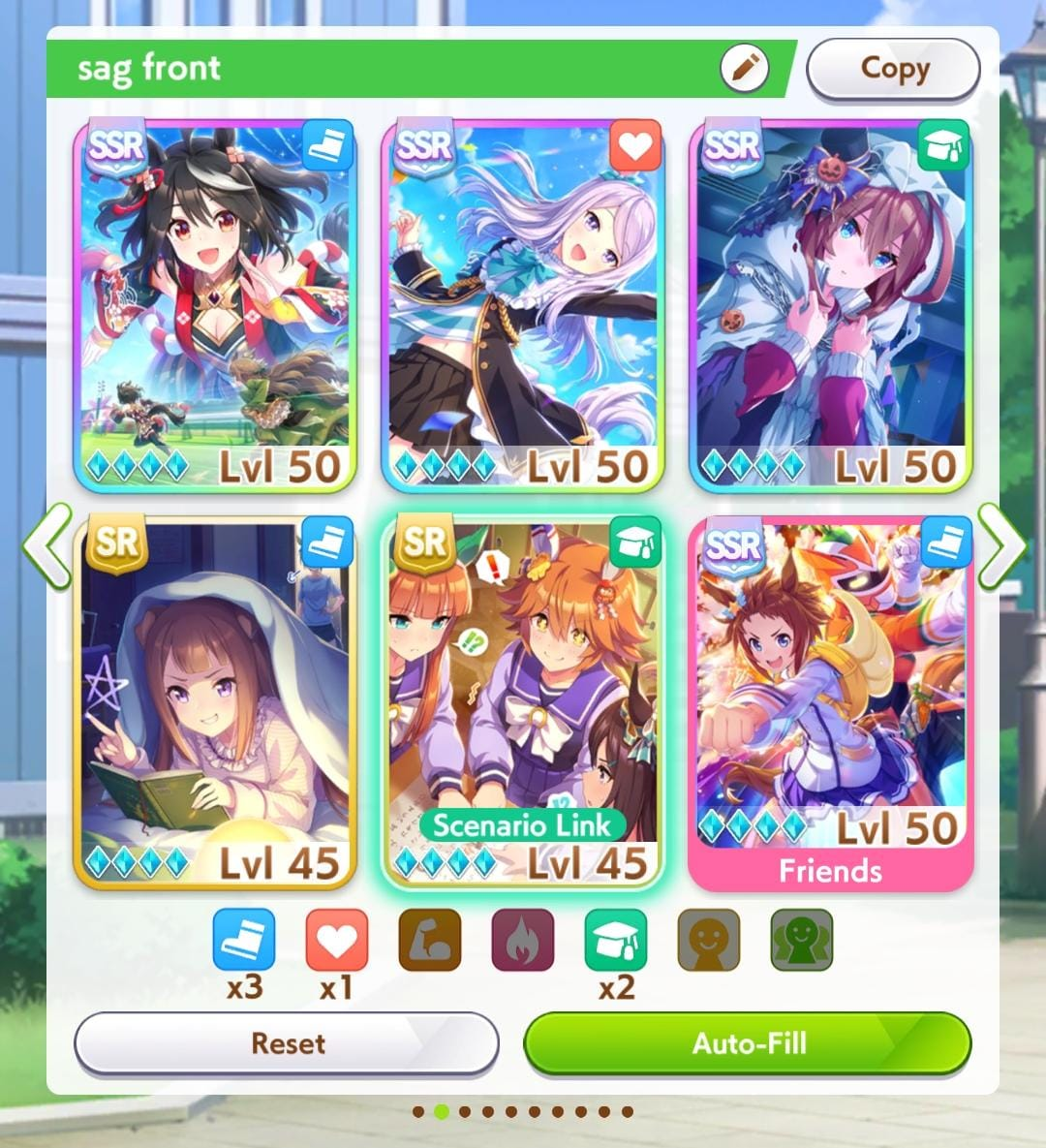 >>553389689If you're able to get 18 Stamina spark parents you could try Kitasan/Sweep/Speed SR of choice (I like Halo)/Riko/Bourbon/borrowed Power Rice ShowerI've been using it and got a 15000 score Seiun today that I couldn't use because she didn't roll Groundwork