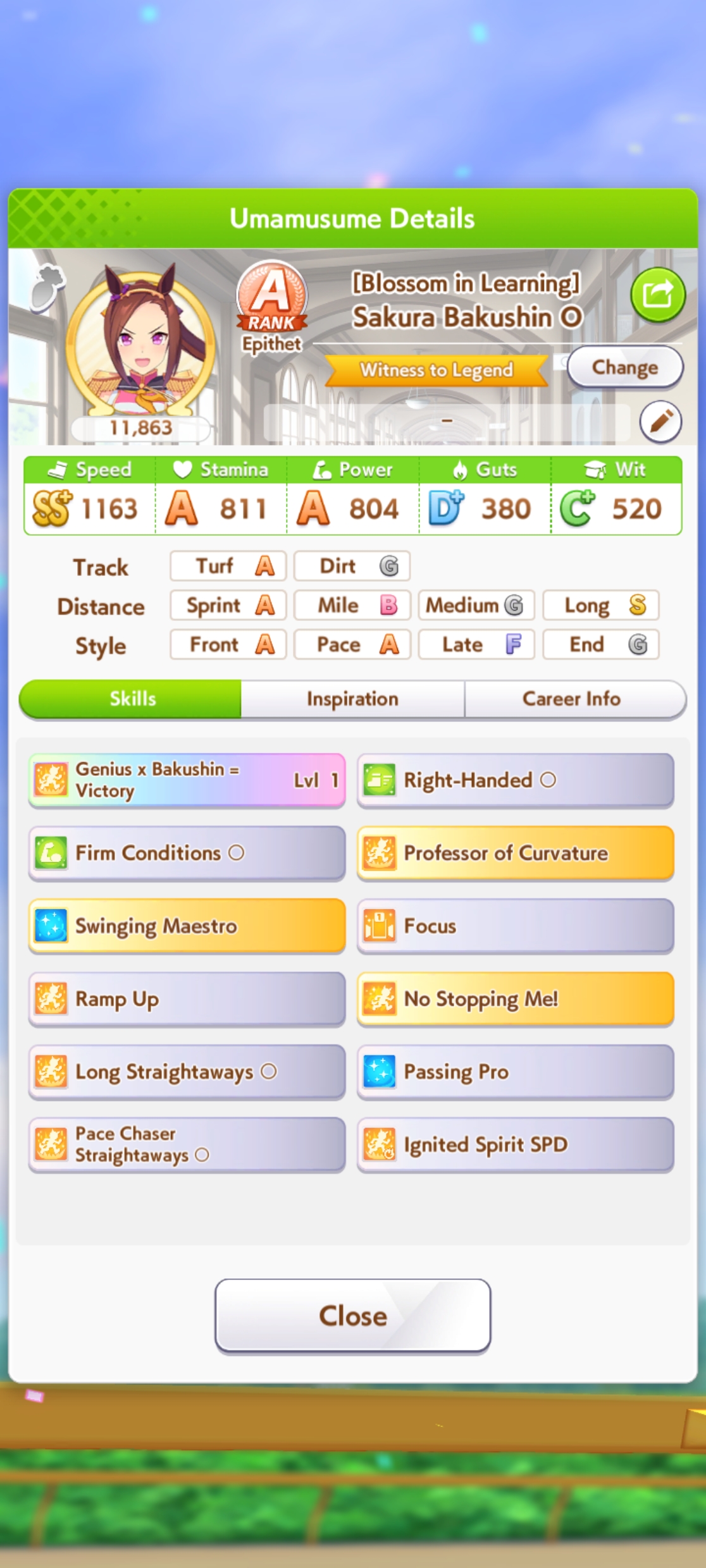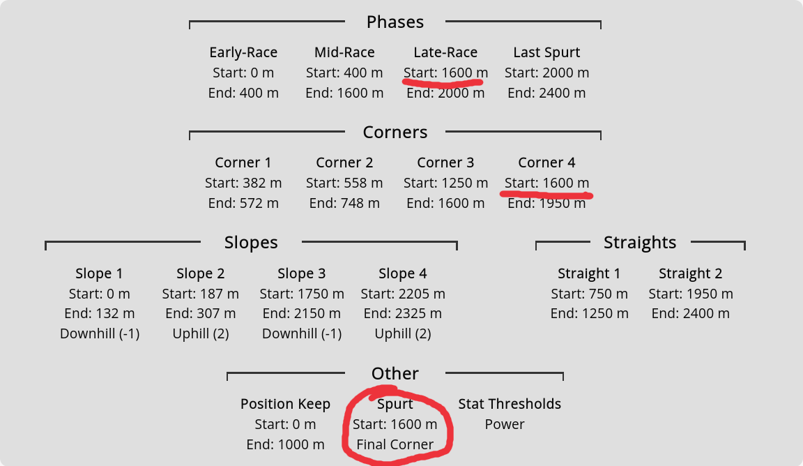 I ran some numbers on the chances of activating the xoguri unique, in total and per distance.>top: corner recovery, hydrate/race planner, 777>bottom: top + straightaway recoveryActivation below 1420m is exclusively a mid-race speed boost, 1420-1700 is speed carry-over + some acceleration, 1723 is the usual 777 activation, and >1900 is late-race speed boost.Those numbers are for 800 wit, but the ratio of successes across distances is pretty much independent of wit.