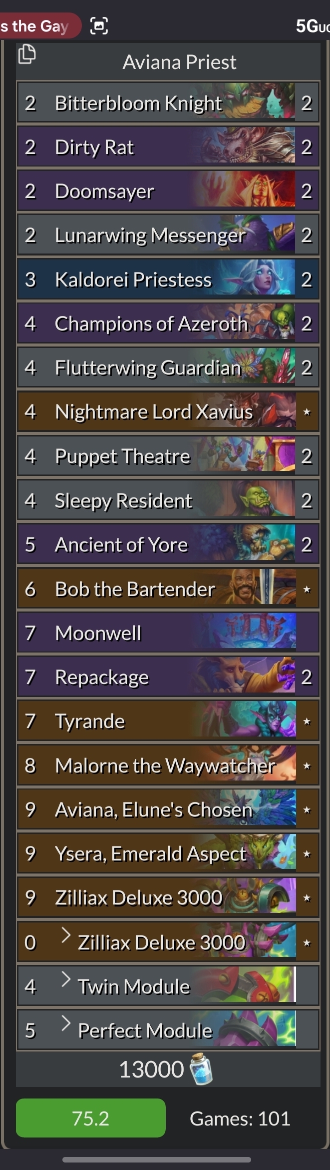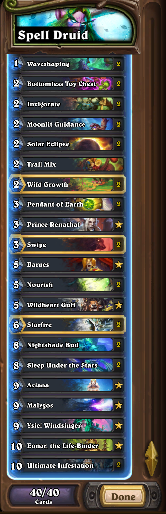 >>553439380Thanks God she's soon to be gone, every single Druid I've played against for the last month had exactly a Trail Mix>Aviana>1 Mana 10 mana card curve each and every time.