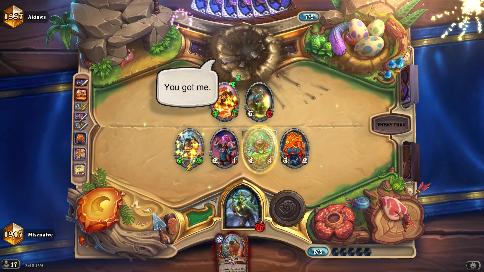 >>553804265he's playing jank off meta deck and complaining about rngright now he seems to be trying the infinite atk weapon + pirate that takes weapon atk + dissolving ooze combodoesn't seem very reliable