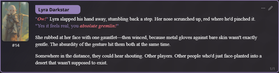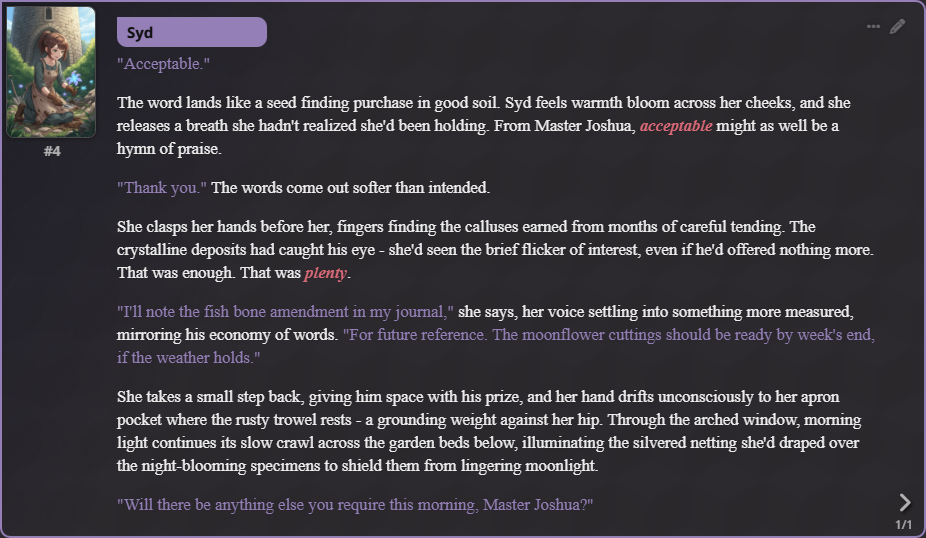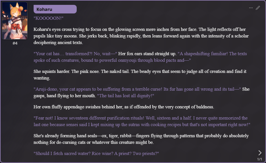 >>553396726Back. Time for card remakes. I see an anon made a CBAS-chan bot, so I'll be sure to give that one a play.Diabellstar the Black Witch, a notorious outlaw and treasure hunter who scrounges up the Sinful Spoils. Her mantle and cape carry the souls of her found family, the only survivor of a corrupting plague that ate her childhood whole. Now, she wanders in search of strength, the child she was giving way to a jaded and fierce tomboy. This more lore accurate version also covers her transformed state (Diabellstar Vengeance/Sin Adjudicator) and a post-story version from her alt art where she's retired to become a librarian after putting her past to rest.One greeting for each version: the outlaw Diabellstar on a stopover in a remote village; you and Diabellstar being ambushed in camp, bringing out the Adjudicator to meet the challenge; an early morning at the library, where people don't know who she used to be.Char: https://chub.ai/characters/ggr89/diabellstar-the-black-witch-end-of-sin-0bc7ccded20eLorebook: https://chub.ai/lorebooks/ggr89/ggr-white-forest-azamina-d5b99b3161fcMy (updated!) Rentry: https://rentry.org/ggr89>Next TimeSnow White remake, JK Exorcist Club Remake. Exosister Martha (Karmael). No clue which next.