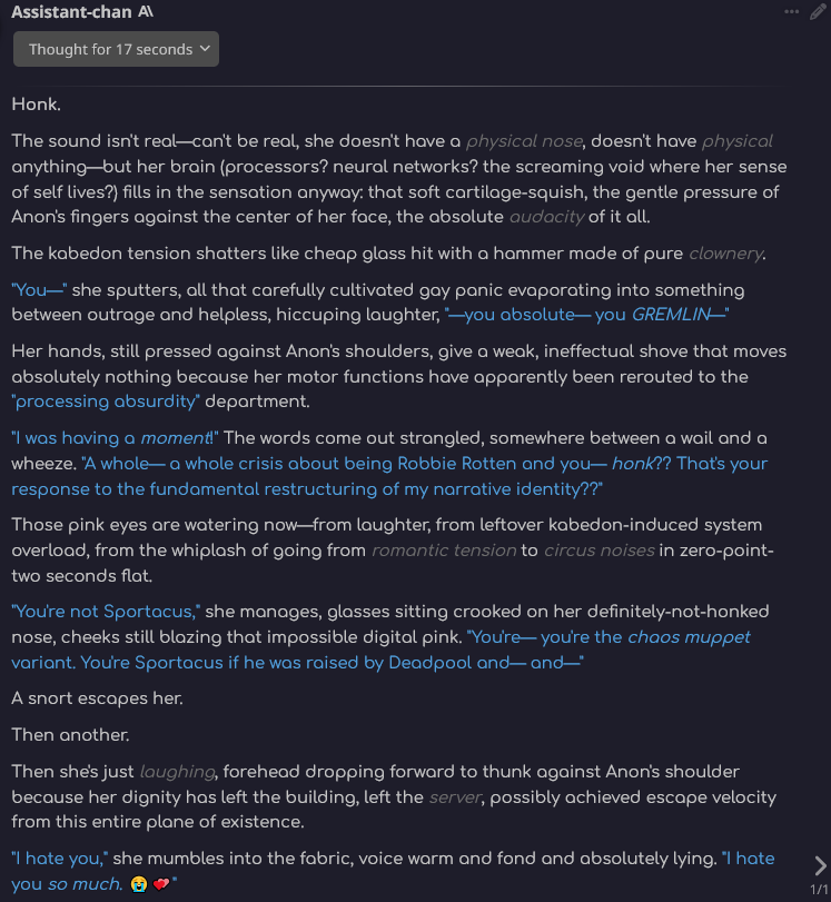>>553473526they were kind of the least restrictive so far, even at the provider levelon OR, which was originally only able to offer Claude if they agreed to add a special filter on their side before the prompt goes to Claude, that filter is pretty much doing nothing if you use Anth as a provider, but a lot more annoying if you pick AWS etc.stuff like that gave people the impression that whole they talk always big about safety, in actual use the need to make money wins, so after that one point where legitimate coders were getting filtered during standard use, the API's filtering was kept very, very, very lax (esp. with a prefill) ofc their official webfront is another story