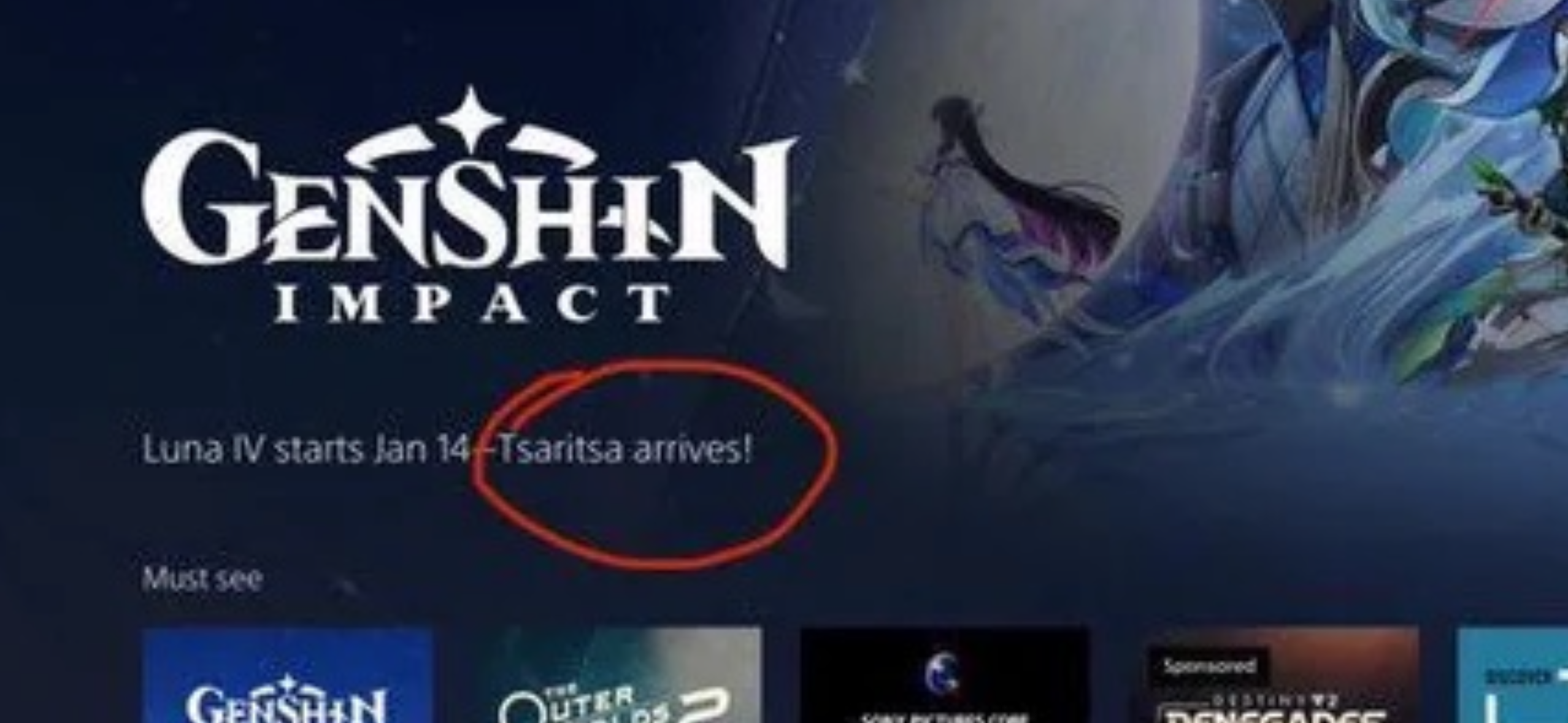 Previous: >>553371026>Character Teaser - "Columbina: Where She Dwells"https://youtu.be/ME4OGvcPBUs (EN)https://youtu.be/7zLvIrPBGF4 (JP)>Version "Luna IV" "A Traveler on a Winter's Night" Trailerhttps://youtu.be/_yuHIzPJGHA (EN)https://youtu.be/wTL5hRtmWjM (JP)>Outfit Teaser: Teyvat Style – Nocturne of Serenityhttps://youtu.be/Q5I3xKJfIO4 (EN)https://youtu.be/TGsTYPeOtxw (JP)>Current character banner: Xilonen, Varesa, Chevreuse, Iansan, Gaming>Current weapon banner: Peak Patrol Song (Sword), Vivid Notions (Catalyst)https://www.hoyolab.com/article/42820131>Daily check-in rewards (permanent)https://webstatic-sea.mihoyo.com/ys/event/signin-sea/index.html?act_id=e202102251931481&lang=en-us>Redeemable Codes with Primogems (all regions): https://genshin.mihoyo.com/en/giftGENSHINGIFT8X73KH58KDHNP3GXX56W3VG9>Useful Links (Wiki, Simulators, Maps, Character Builds, /gig/ friendlist, Third-Party Tools, etc.)https://rentry.org/giglinks/gig/ OP pastebin (use this if making new thread):https://pastebin.com/ca0zseQ9