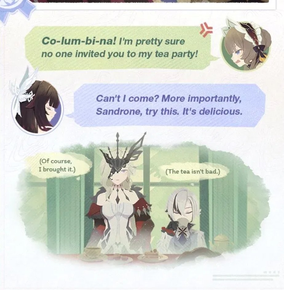 >>553420334>All her interactions were transactionary.Sandrone and the others don't profit from having tea with Columbina so it's not transactionary by any stretch of the imagination. The only way to make sense of this is if Columbina is just an unimaginably dumb person.