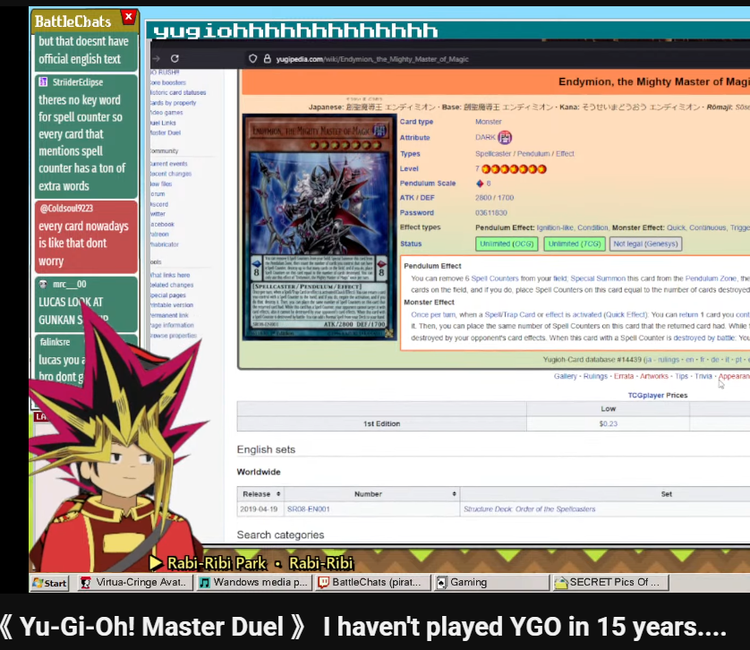 #6718 - Somehow less offensively bad than the other card revealed today editionPrevious: >>553240976>SimulatorsAutomated:●EDOPro (PC/Android): https://projectignis.github.io/download.html●Master Duel (Multi-plat): https://store.steampowered.com/app/1449850Manual:●Duelingbook (online): https://www.duelingbook.comTag: “/dng/” Password: “vidya”; on EDOPro, specify server.Genesys Duels: MR5, TCG, Custom Rules: No Links/Pend/EMZ/Pend Zones>LinksRulebook: https://www.yugioh-card.com/en/rulebook/Wiki: https://yugipedia.comProbability Calculator: https://yugioh.fyiStock Market: https://yugiohprices.comDatabase: https://www.db.yugioh-card.comMisc Info: https://www.formatlibrary.comBlog:https://yugiohblog.konami.com/Alt Format:https://www.yugioh-card.com/en/genesys/>BanlistsTCG: https://www.yugioh-card.com/eu/play/forbidden-and-limited-list/ (Oct 27/Next List: TBA)OCG: https://yu-gi-oh.jp/news_detail.php?page=details&id=2406 (Jan 1/Next List: April 1)>DecklistsOCG: https://roadoftheking.com https://tonamel.com/competitions?game=yugioh_ocgTCG: https://ygoprodeck.com/category/decks/tournament-meta-decks>NewsJP: https://yugioh-starlight.comEN: https://ygorganization.com>Upcoming SetsOCG:●THE CHRONICLES DECK - Charmer (Jan 24)●Blazing Dominion (Jan 24)●Deck Build Pack: Cosmic Rivals (Feb 26)●LIMIT OVER COLLECTION -THE PROTAGONISTS- (Feb 28)●LIMIT OVER COLLECTION -THE RIVALS- (Mar 20)●Chaos Origin (Apr 25)TCG:●Burst Protocol (Jan 23)●THE CHRONICLES DECK - Spirit Charmers (Jan 23)●Maze of Muertos (Feb 20)●Legendary Modern Decks 2026 (Mar 13)●Rarity Collection 5 (Apr 10)>Events●/dng/ League S1 (Week 19, Jan 8-Jan 15):https://challonge.com/dngleagueseason1