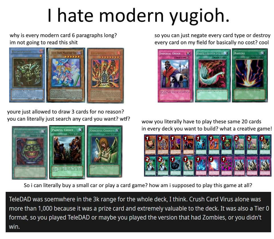 We simply need to gradually release more archetypes with T0 interactions that DON'T HAVE BROKEN ENDBOARDS, while simultaneously being ruthless and banning broken shit we currently have to bring down the game's power level (and maybe even make some older archetypes viable).But that's impossible for Konami because they can't resist releasing broken cards.