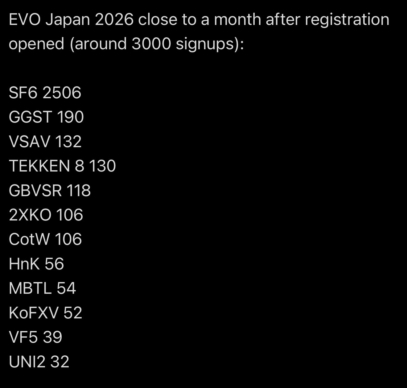 >>553470376the number of entrants for tekken 8 at evo japan so far lol shite game in other words