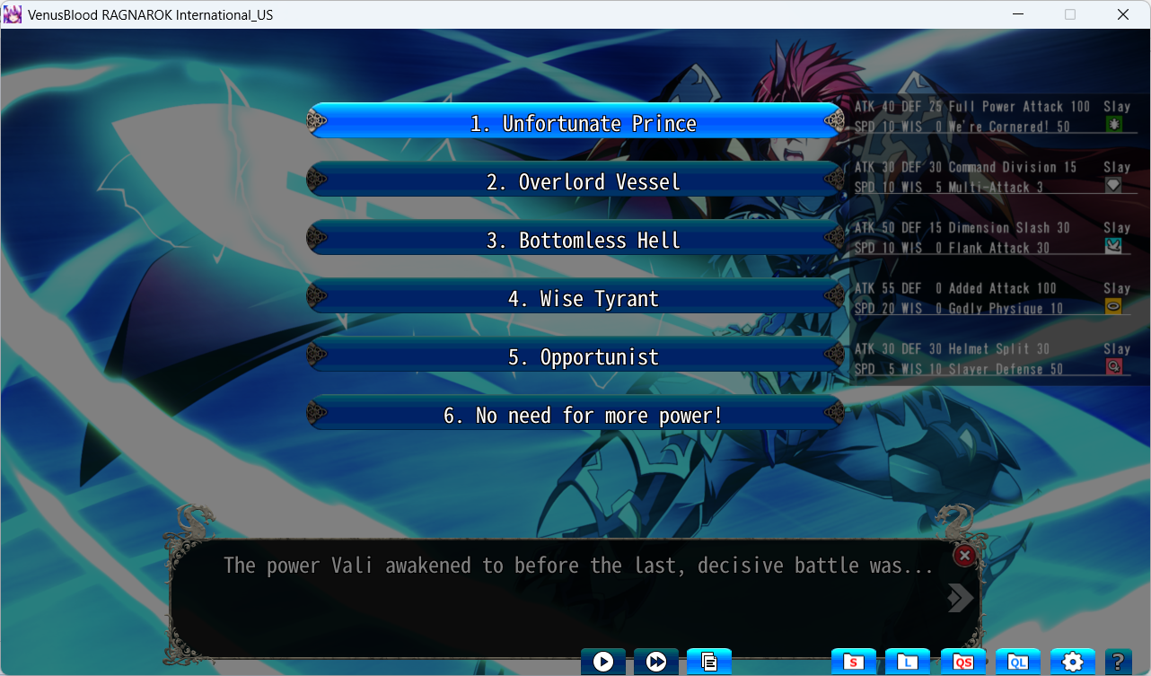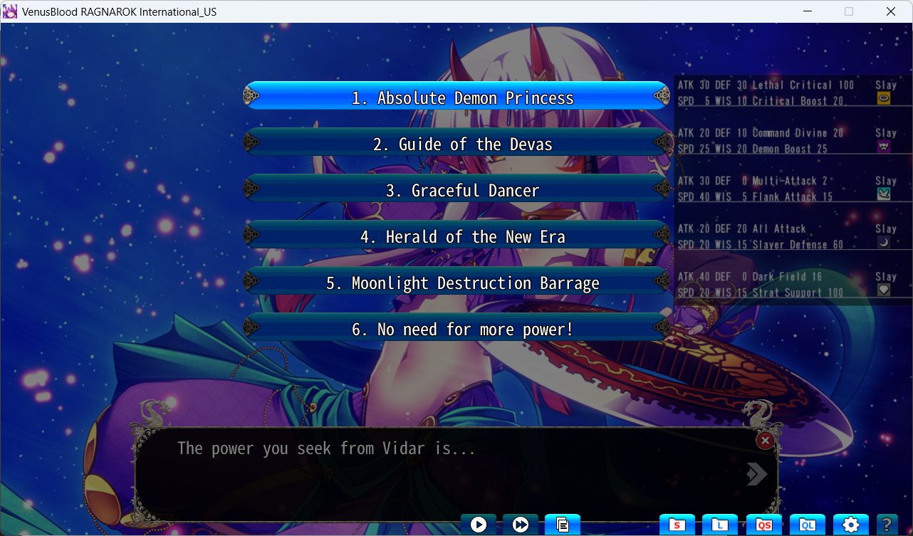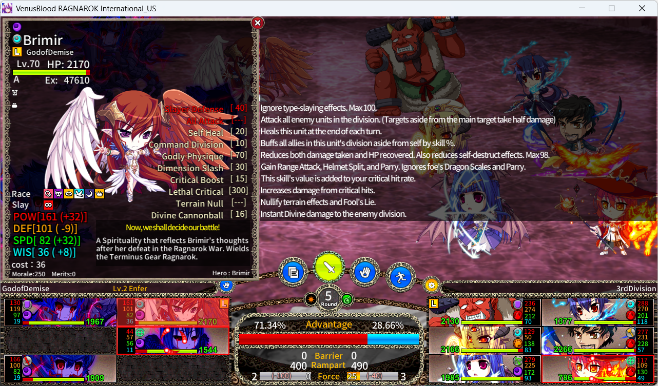 Vidar was kind of the worst character in the game in my mind so far. Maybe in Chaos she is better, but she is a complete clusterfuck.With that said, I have no idea what title to give her. None of them synergize with her current skill except for 2 and 3. 2 would work extremely well with units who are both Demon and Divine like Vali or Loki, but I'm so not ready to jump this wagon just yet with so few units.All Attack and Slayer Defense 60 also sound good. Thoughts?>Norn and Heimdall leftFuck you too game!Did that Anon succeed against SSJ Loki btw?