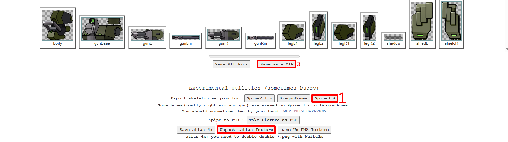 >>553477359Did you uhhhh export the Spine3.8 json from the tool? https://naganeko.itch.io/spine-gifThe anons I learned from told me to export that, and to unpack the .atlas textures for the individual sprite images