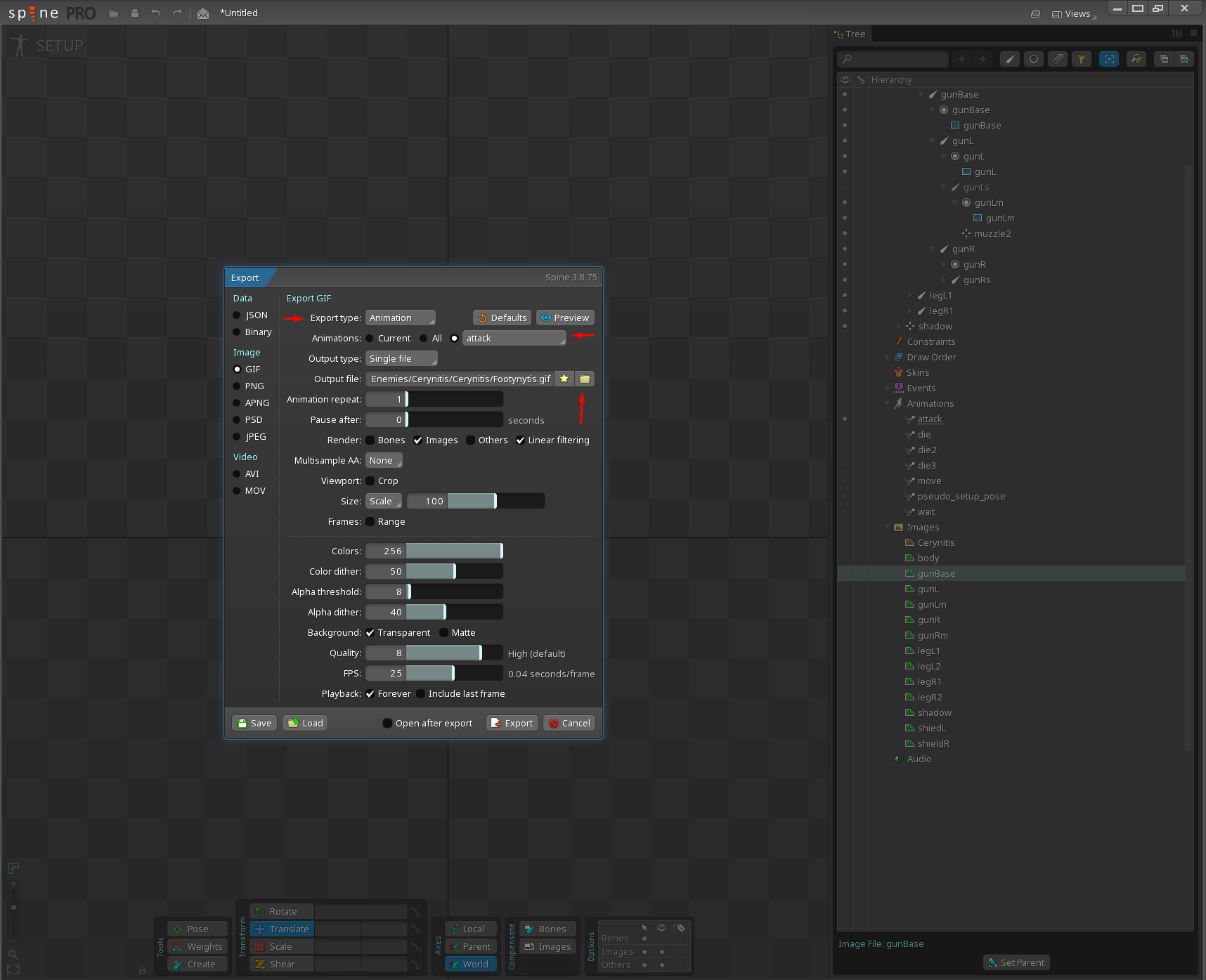 >>553480341For exporting, yea just click on SpinePro on the top right, export as GIF, and choose which animation, or if you want all of the animations, exported, and make sure that if you're doing different exports/animations, you manually select or rename them on whichever file path you want your outputs to go to