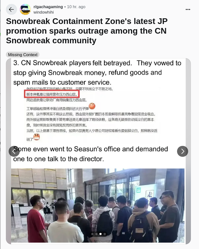 >>553447950Yes, it was her patch, but the enemy guy getting stepped on wasn't the only controversial thing that happened on that patch.The woman we just killed, the one who just became a boss to die, the one called Rozan was quite problematic during that. The only reason she became jobber material instead of main villain was because of how she and her minions were written during that patch.She basically isn't even in the new version of that story now, if I remember correctly.>At least they gave us some good Fritia content...Not a single interaction for characters like Fritia, Mauxir, Eatchel, Acacia, or even Meursault. At least right now.You are aware too of how their chest size keeps increasing right? Not only chest, but proportions too, since Fritia's bottom was far more petite before.Regardless, here is a summary of controversies during the plot of that story (based on my memory):>A guy was stepped on and then killed>The girl who did it was bratty towards you and the way she talked about you getting involved with the other girls was seen in a bad way despite how she starts to like you later>Fritia made a turtle joke (cuck Chinese joke. Only makes sense in Chinese) directed at you>A child called Yao a prostitute (a Chinese pun with her name that only works in Chinese)>Your actions were questioned and rejected when you tried to get intimate with Yao mid-mission in a way that made you say pic related (this was considered out of character behavior for both Adjutant and Yao)>Rozan offered her shapeshifting sexy giant women to her male soldiers to raise their moral. This opened door for a possible hentai plot (regardless if that would really happen) of the soldiers transforming those women into their enemies (our girls) and having sex with them.This is all just about the story, but there was trouble in the office, women getting fired, sabotage, 01, and censorship (different patch, but close to that one).A. DISASTER.