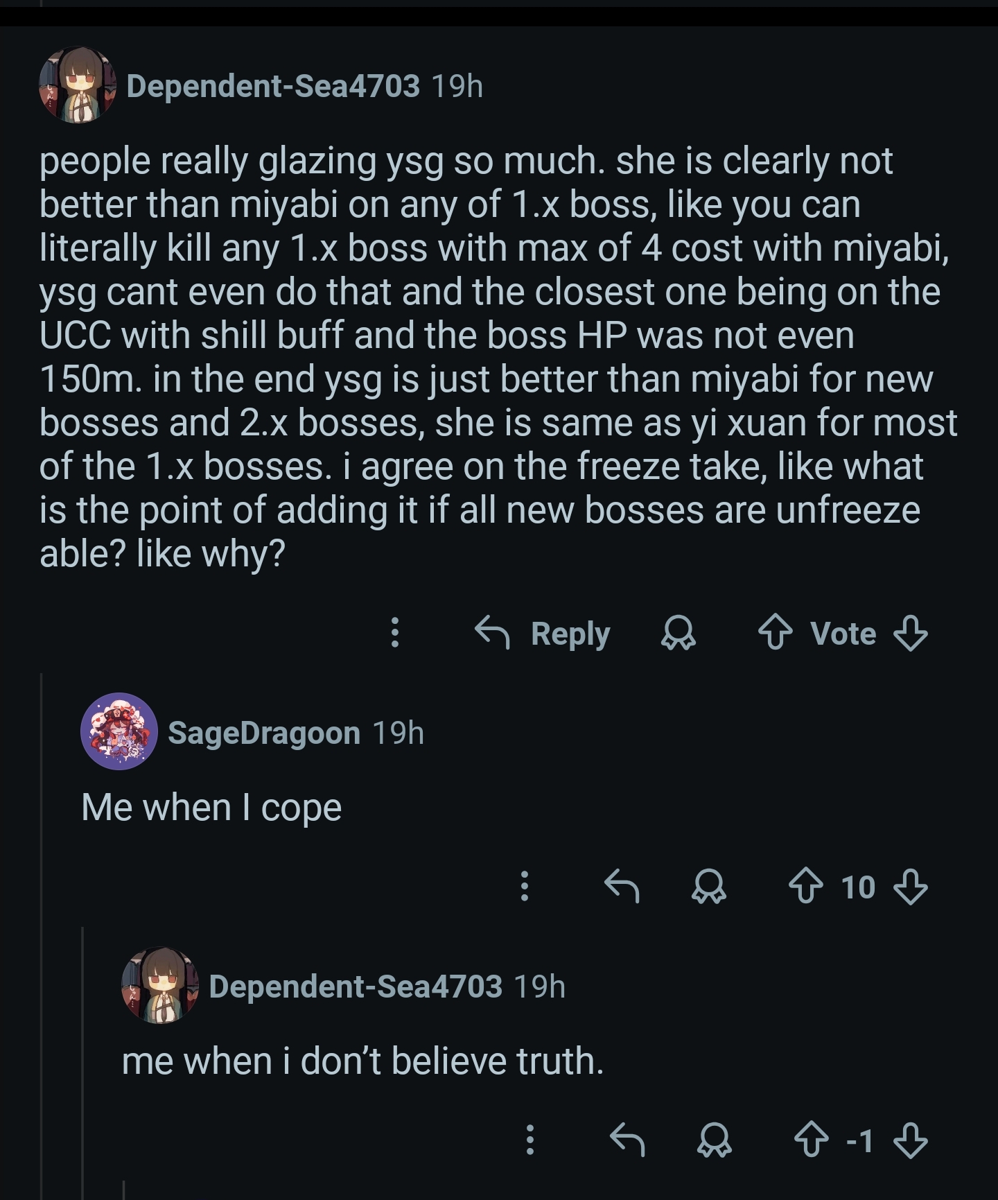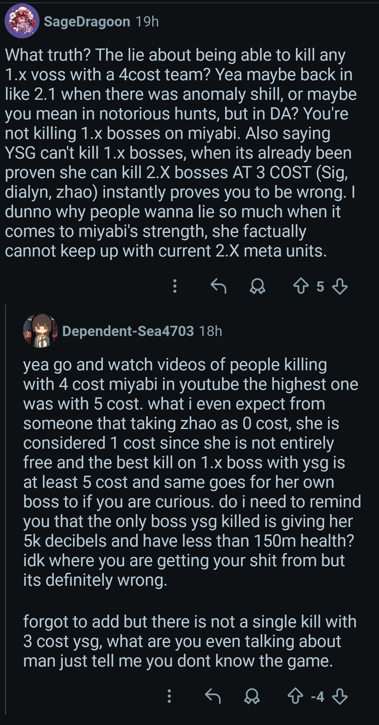 >>553435970>yuzuha T0curious... if miyabi isn't T0 because current content is too prohibitive for anomaly, then yuzuha can't be T0.