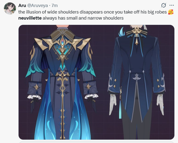 >>553445814Fujos sister, you know why Haikaveh is the most popular Genshin ship while you have to bot Ao3 numbers? Because the average person doesn't see anything weird with Neuvillette asking Sigewinne to take care of a kid he sent to jail for murdering his parents.>He gave Wrio soup Yeah, before the trial, when he didn't know who Wrio was. Because Neuvillette is not an evil drone and would care about a homeless kid on the street.>Personal relationship Everytime they talk is about work or slugs. Hopefully you get them actually hanging out like normal people in the skin quest.>Nobody else got that treatmentHe bypassed the rules to allow Poorina to use the Opera Epiclese, and he specifically said he did it because it was her. He said he would give her public money to sustain herself. This is what blatant favoritism actually looks like.Go back to Twitter now and come back tomorrow with preload shit. Neuvillette is garbage and so is Wrio btw. Mavuika mogs the entirety of your femcel region.