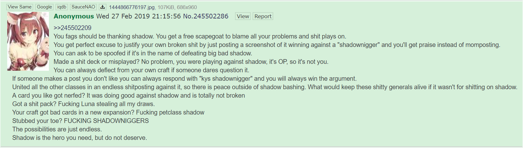 I'm ok with shadowverse being a niche game, i'd rather it not have a retarded fanbase like limbus and nigger archive>>553456092based