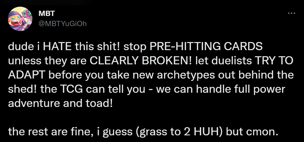 >>553493542I'm sure even the contrarian that he is changed his opinion after konami decided to let maliss at full power for half a yearsame dude who acted like freeing monkeyboard and drulers would ruin the game btw