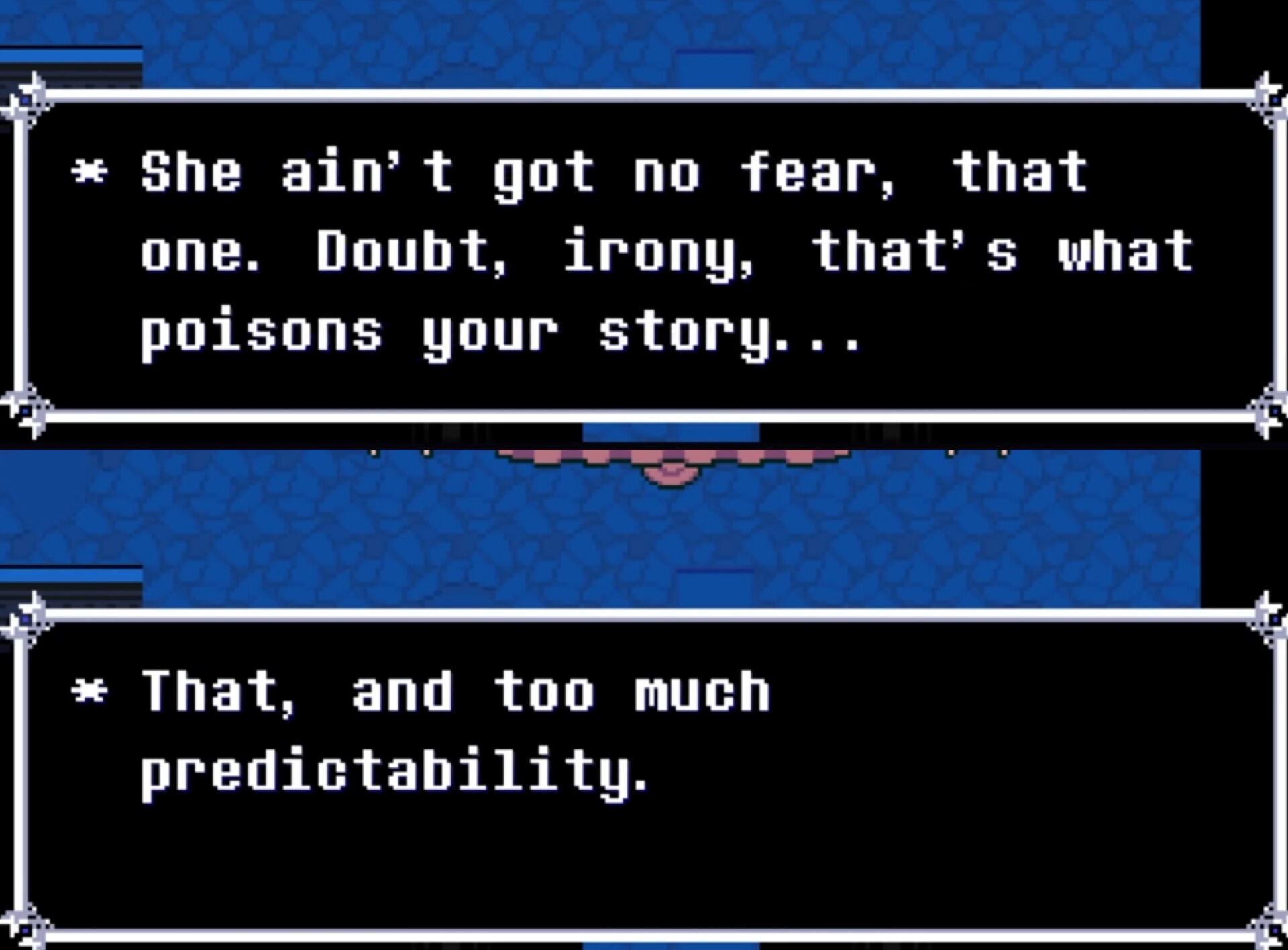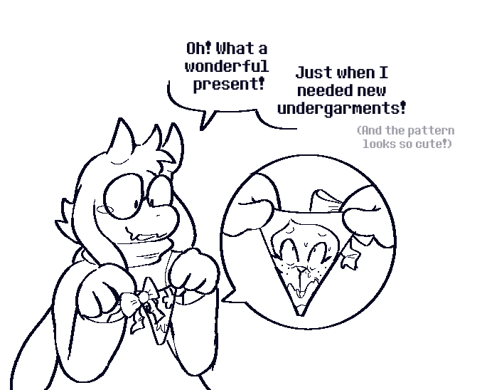 >>553482762>Kris just drags Dess under the bed by the leg and eats her>Asriel's left lying there like "Bro, not again"