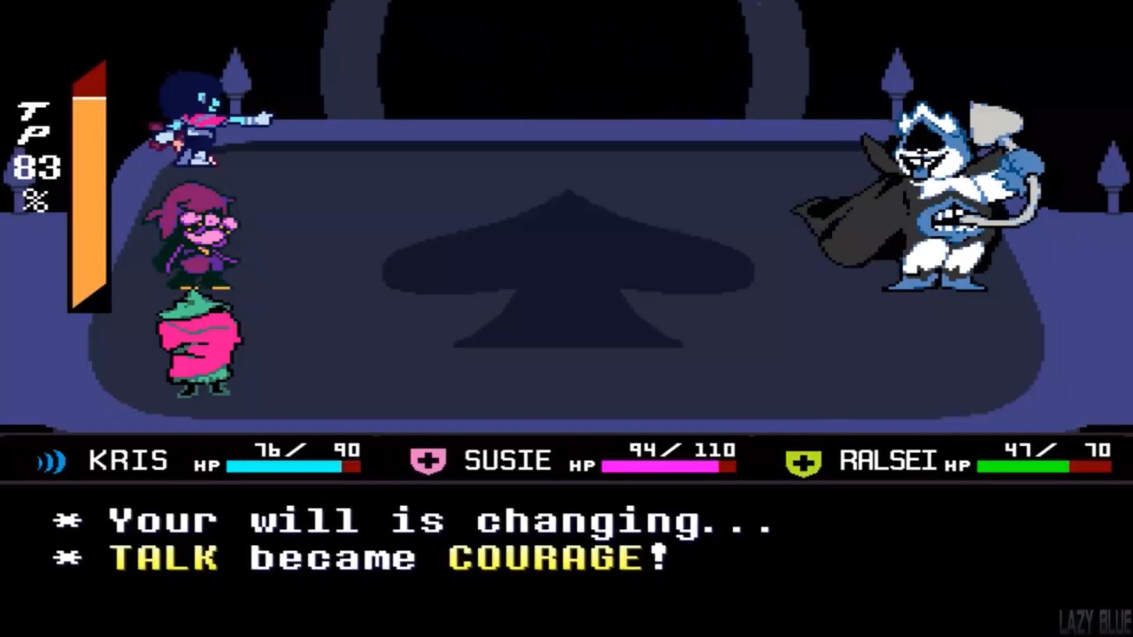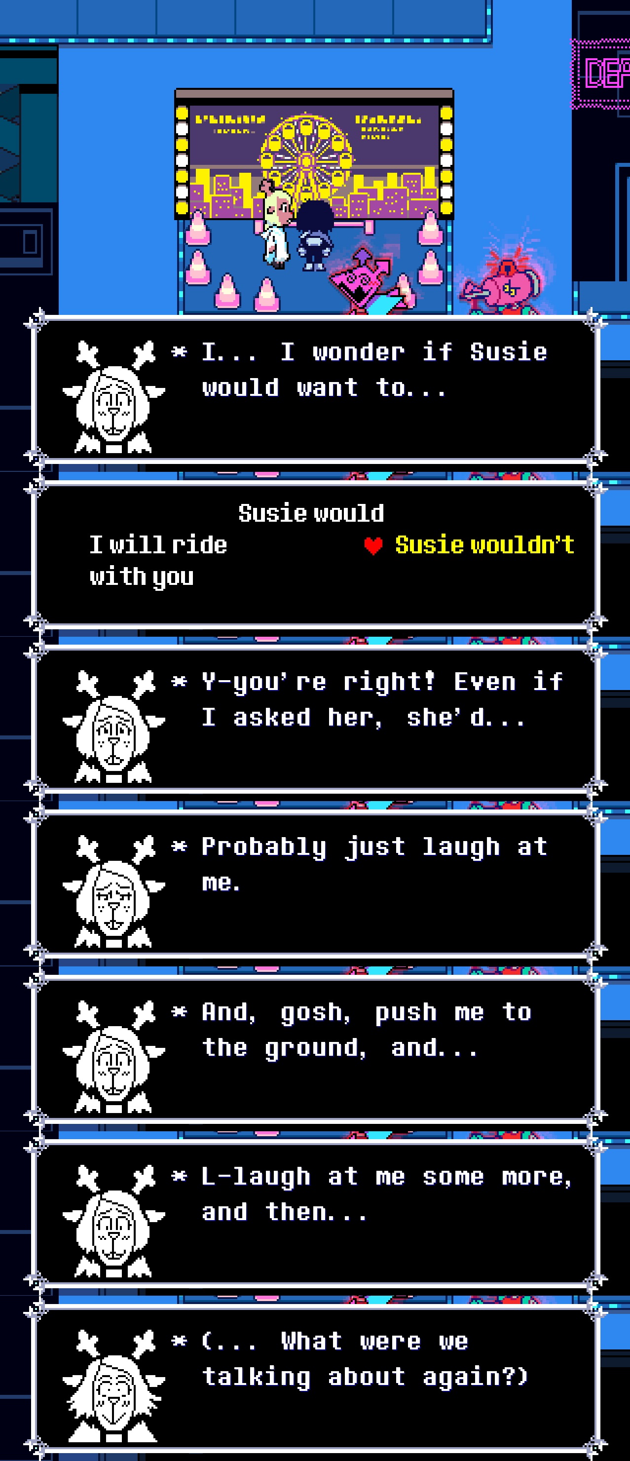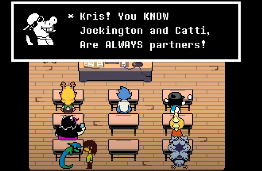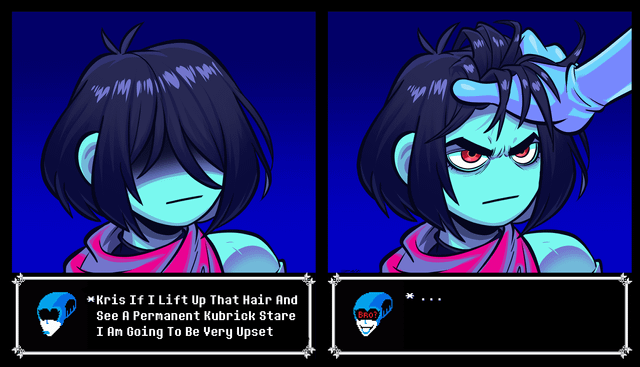 >>553505650For me, it's Kris gently catching the SOUL. This one is actually used in the game too, but the closet door hides it.