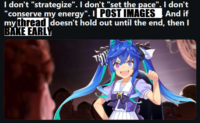 >>553508758My seiun cucks every xoguri of their angling procs but somehow still lacks the firepower to win against them in the final spurt. Maybe due to nsm and mine not having long s. But yeah, my point is XOguri is the strongest pace chaser i've seen yet in cm8 lobbies.