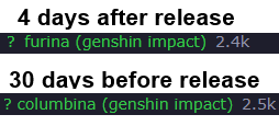 Kinda feel like I already missed out on Lunar meta, by skipping Ineffa, Flins, Lauma and Neferand that it's on it's way outMaybe I just skip Lunar reactions and go all-in on whatever Varka and Nicole is doing. But that probably requires Durin... Which I also skipped.LOOK! This is what happens when new characters are worse that my current teams, until they get a partner 3+ months later!It's so fucking awkward to roll for characters that doesn't naturally build on my existing teams, because everyone are more specialized now