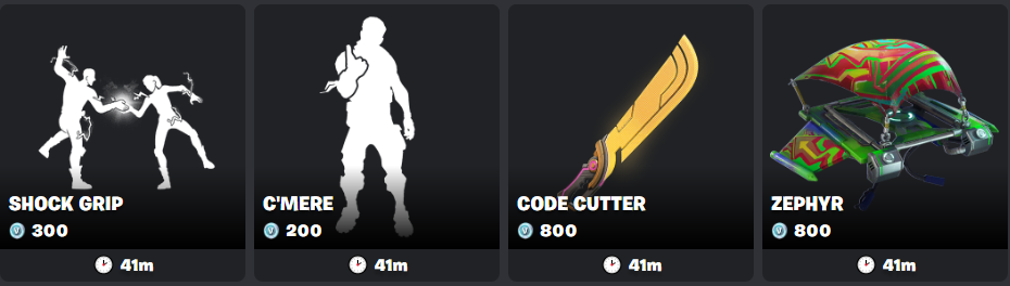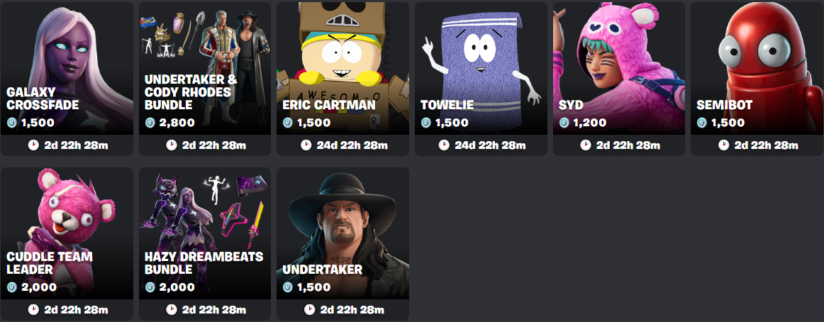 tonight>Pacific Break (x2) [ID: BlobRock]>WWE (x3) [ID: Undertaker&CodyRhodes]>Battle Ready (x4) [ID: BR0112]>Fortnite Drops (x4) [ID: FND0112]>BMW (x1) [ID: BMW]>Jam Tracks (x4) [ID: JT0112]>Galaxy (x4) [ID: Galaxy1]