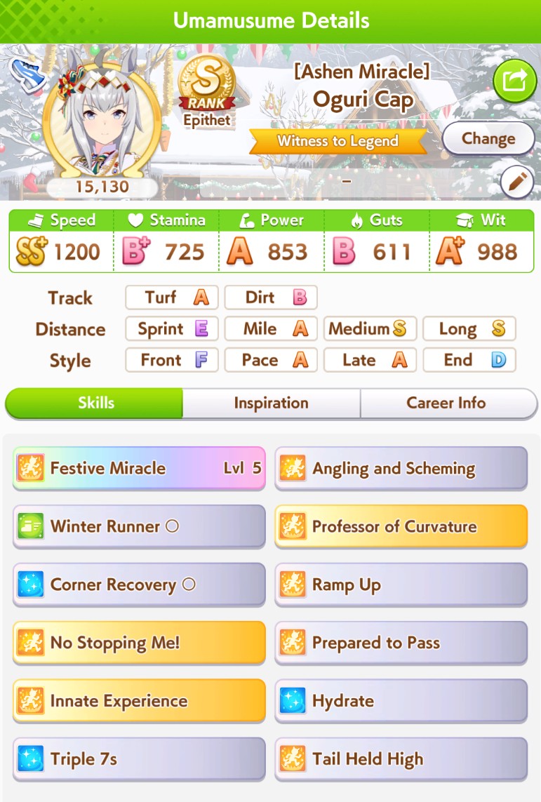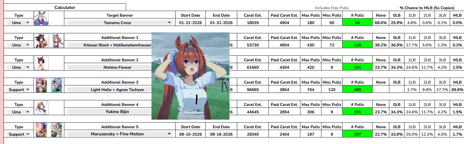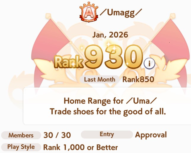 Previous: >>553484590>Global Game NewsLink your account to Cygames iDCurrent Scenario: Aoharu Hai aka "Unity Cup"Current Rate Up Trainee: Christmas Oguri Cap (3* alt), Christmas Biwa Hayahide (3* alt), Mejiro Dober 3*Current Rate Up Support Cards: Narita Taishin (SSR), Mayano Top Gun (SSR), Daitaku Helios (SSR), Vodka (SR)Late January - Sagittarius Cup - Nakayama Turf 2500mhttps://umamusume.com/news/100040/https://pages.snep.pw/uma/anni-skill-changes/>JP Game NewsCurrent Rate Up: Gentildonna 3* and Orfevre 3* rerun, NY Sakura Laurel 3*, NY Ikuno Dictus 3*, Oguri Cap 3* (Cinderella Form), Stay Gold 3*, Air Groove (Speed SSR), Fine Motion (Power SSR)New Scenario "Yukoma Hot Spring" releasedTimeline: https://uma.moe/timelineCygames Webstore: https://webstore.cygames.com/en/umamusume_en/>Thread Clubshttps://rentry.co/umaglobalclublistYou must be E3 (20k points) to join a circle. Apply with /uma/ or /vg/ in your profile or post ID in the thread.>All Guides & Resourceshttps://rentry.org/uma26Game databasehttps://gametora.com/umamusume (Click the gear to switch between JP / global server info)A basic guide for newfagshttps://rentry.org/umaglobalFind networks if your region is blocked from the game or clienthttps://www.umavpn.top/93Seiyuu & Concertshttps://rentry.org/umstUma Texthttps://umareader.idsmile.xyz/