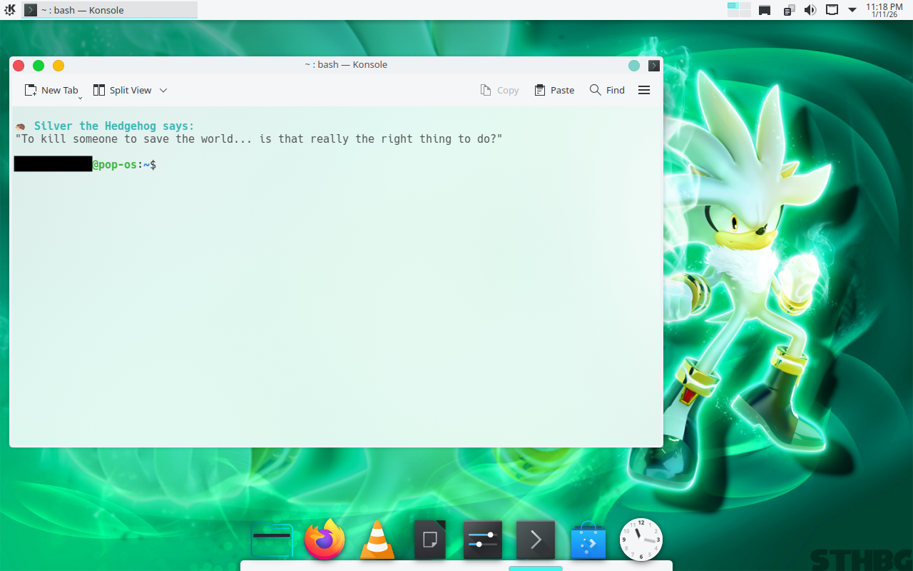 I've been customizing the theme on my spare laptop with my favorite hedgehog in mind. Most recently I've gotten the terminal to open with a quote from Silver the Hedgehog. AI actually made this very easy for me to do, I don't know what I'd do if I were trying this before Claude and ChatGPT became a thing.